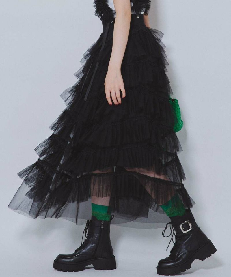 細かいティアードデザインがフェミニンなチュールスカート。チュールを重ねることで立体感が生まれ、歩くたび動きの出るデザイン。ボリューム感のあるシルエットで甘くなりすぎず、モードな印象に。 【model】:H165 B78 H83 / H163 B78 H84