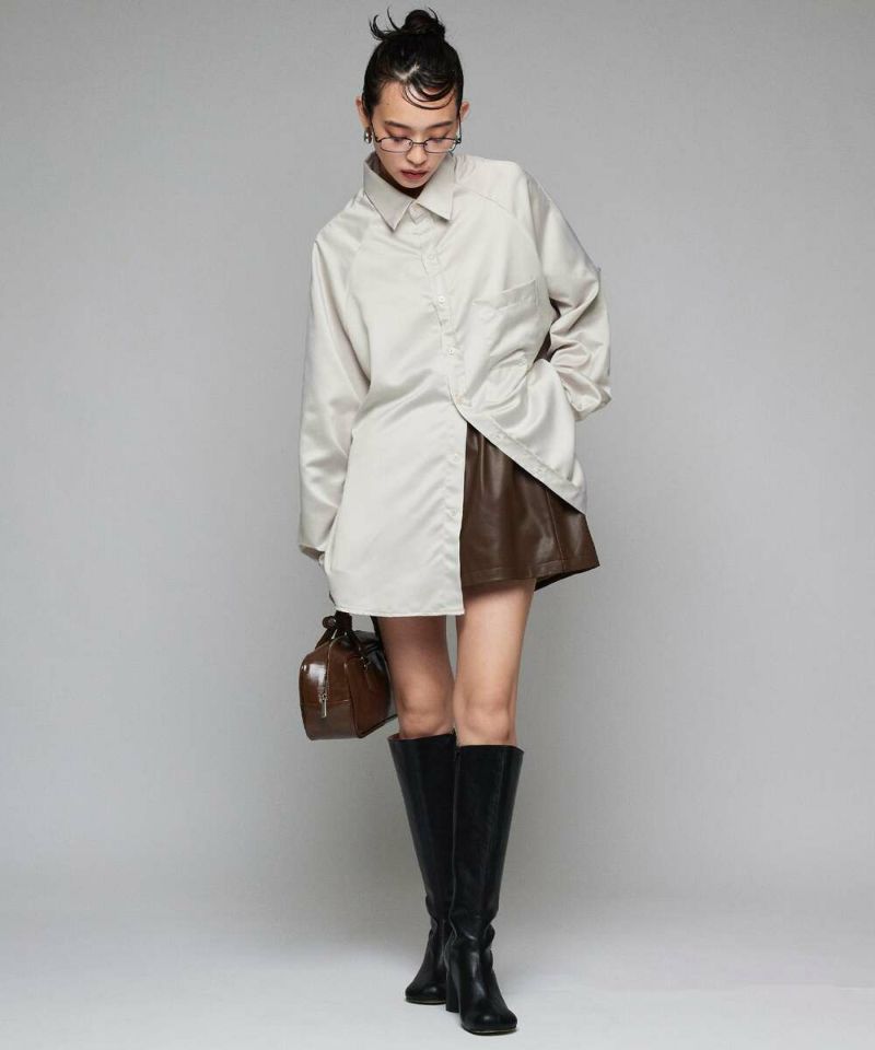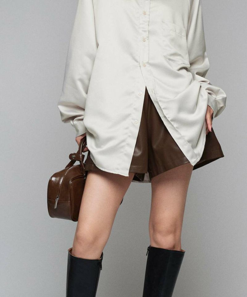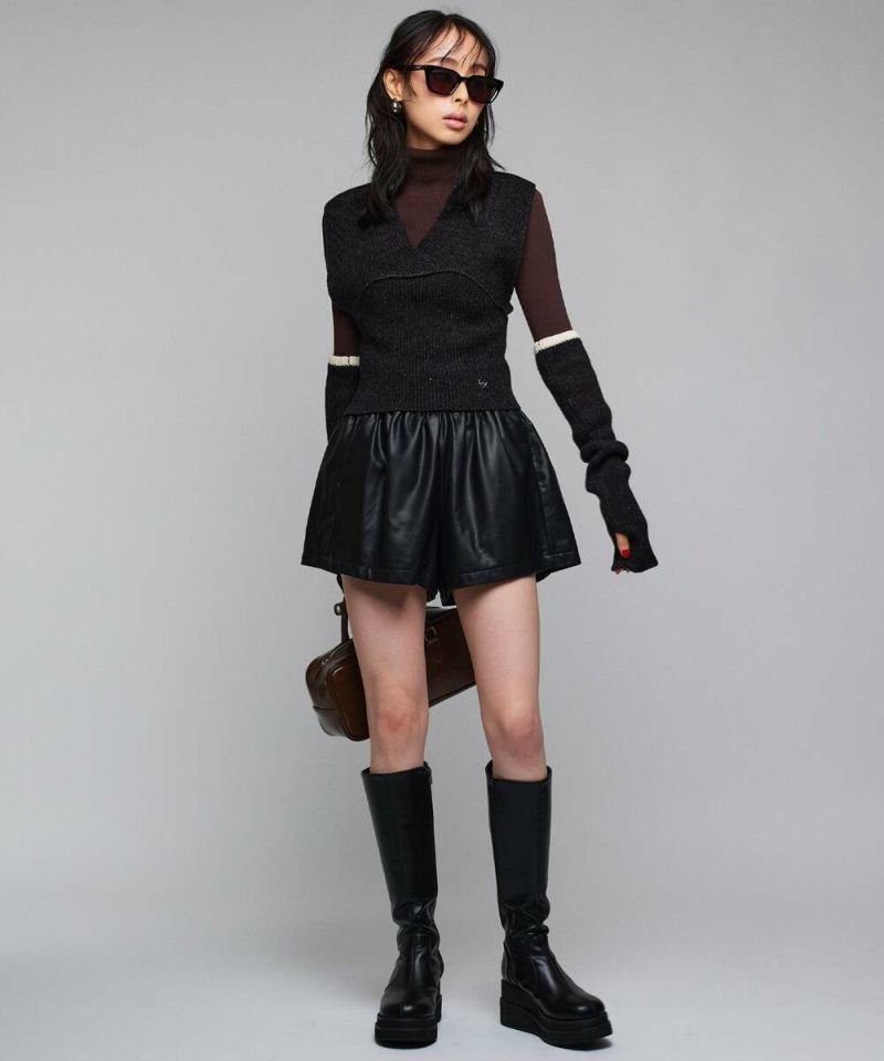 ベーシックなフェイクレザーショートパンツ。ウエストの幅広いゴムシャーリングがストレスフリーに着用。ゆとりのある広めの裾がスタイルアップ効果を。【model】:H165 B78 H83 / H163 B78 H84