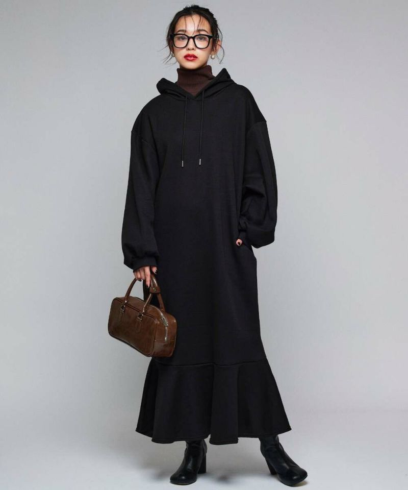 大人可愛い印象を与えるマーメイドシルエットのワンピースに、フードをプラスしてカジュアルダウンさせたアイテム。ゆったりとしたオーバーサイズで抜け感も演出。裏起毛で保温性がありながらも、少し薄めの素材感なので着膨れせずにアウターが羽織れるのも嬉しいポイント。【model】H163 B78 H84