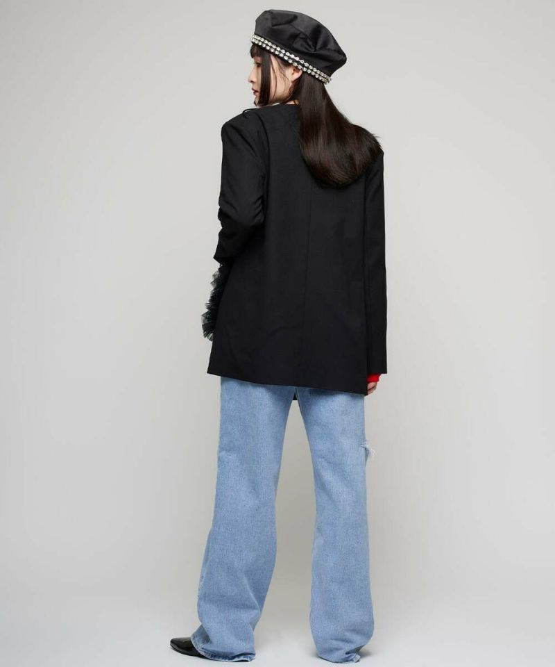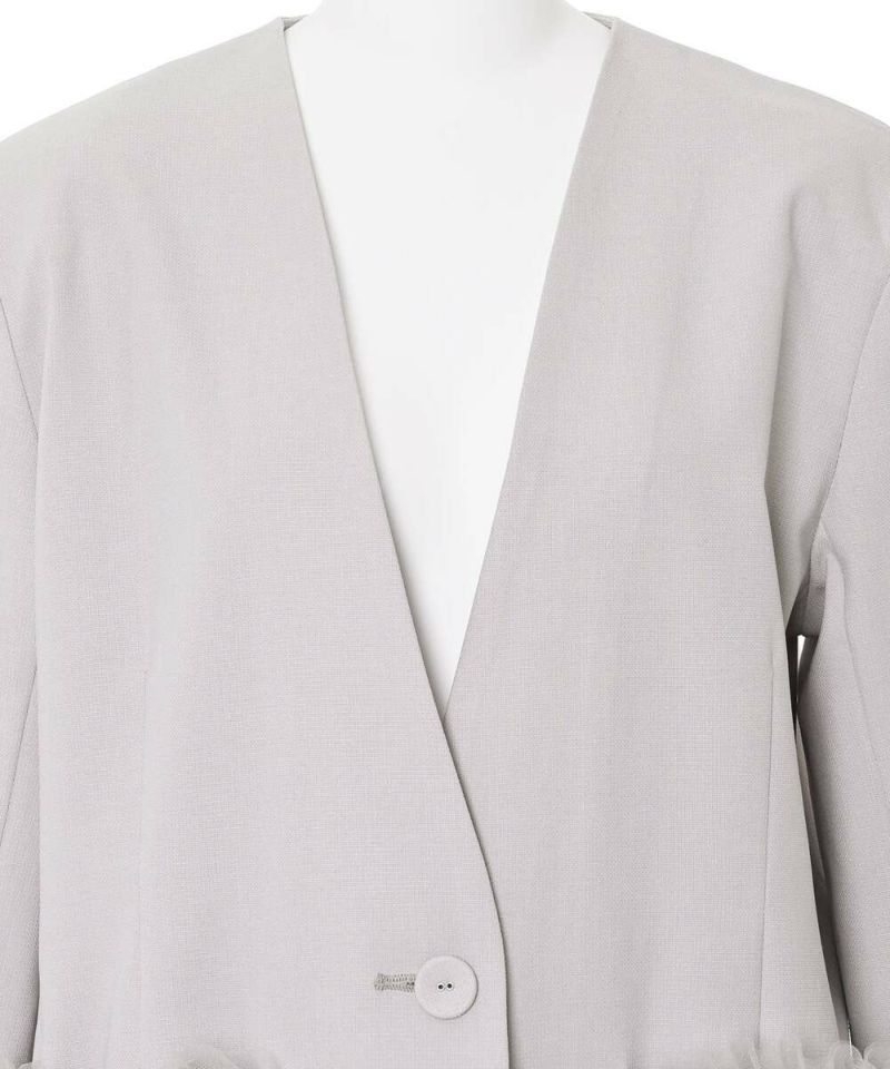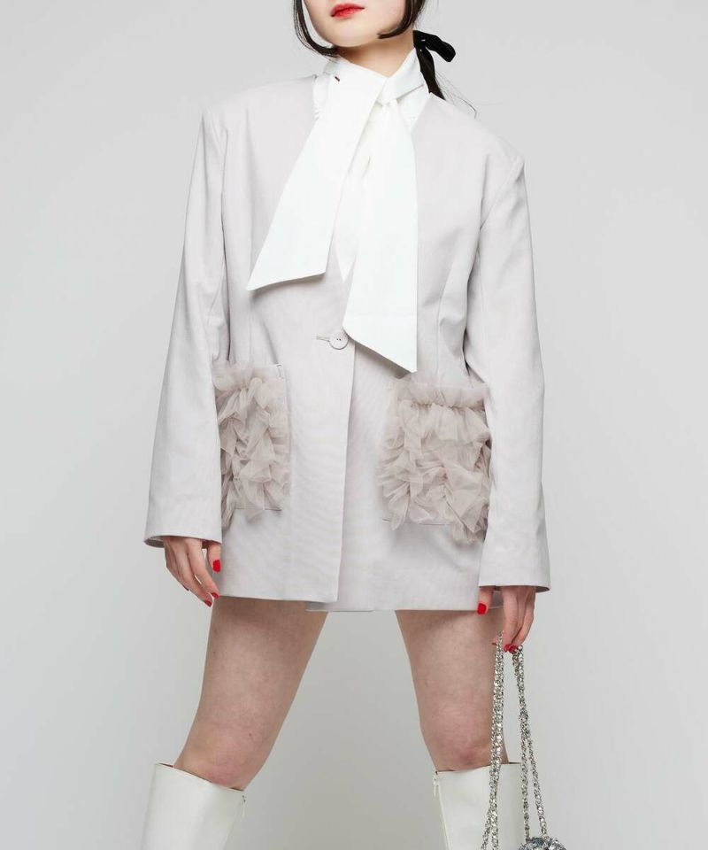 スタイリッシュなスタイリングが叶うノーカラージャケット。フォーマル、オケージョンシーンにも活躍する綺麗めなシルエットに、ポケットのチュールフリルがフェミニンな印象をプラス。ボウタイブラウス等と合わせるのがオススメ。肩パッド入りで型崩れしにくく、初夏まで着用できるサラッとした薄手の素材感。モデル身長:156cm