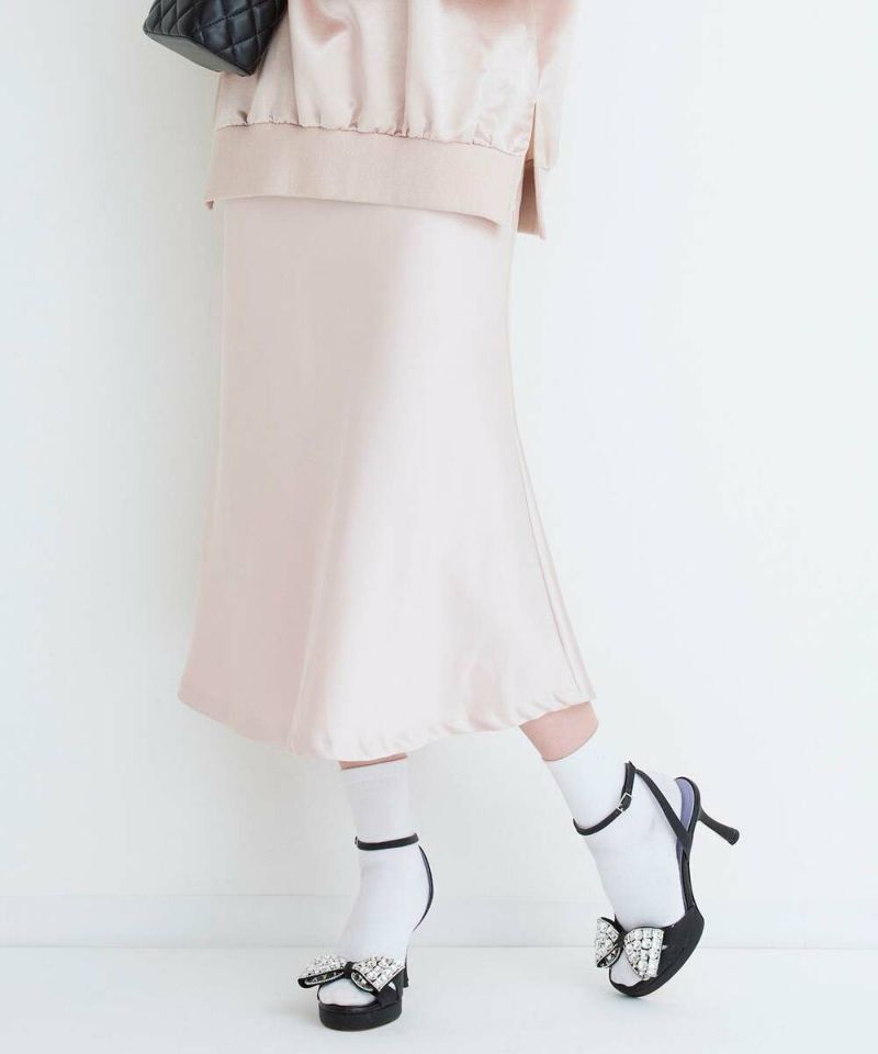 裾に向けてさりげなく広がるシルエットが綺麗なフレアスカート。動くたびに程よく現れるドレープと、落ち着いたマットサテンの輝きが大人のレディコーデのポイントに。【model】:H165 B78 H83 / H163 B78 H84