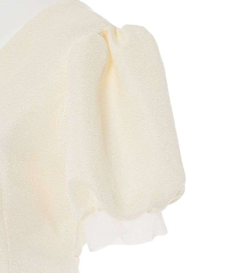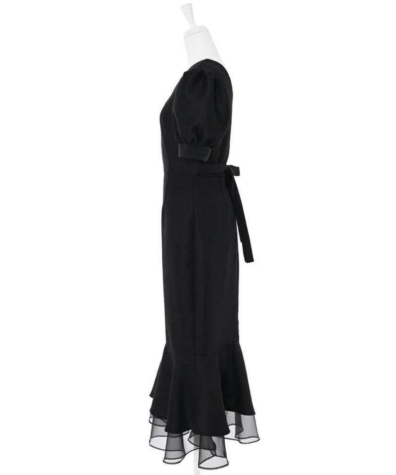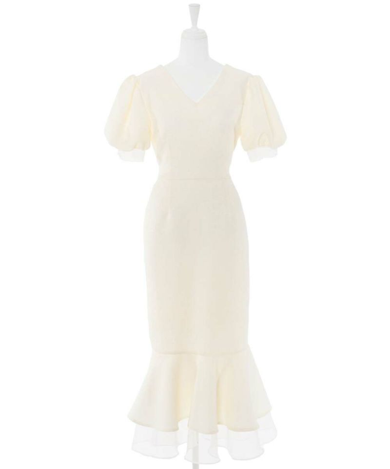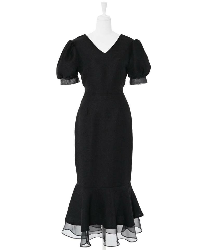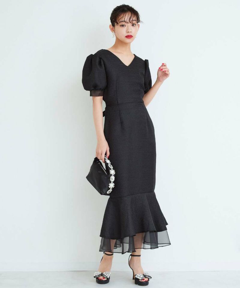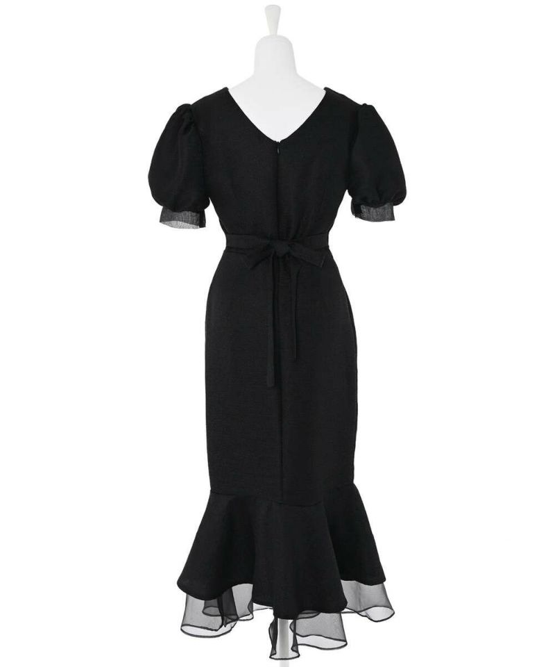 袖口と裾にシアー素材をドッキングしたレディライクなマーメイドワンピース。 高級感溢れるしっかりとした素材に、ウエストマークのリボンと袖パフがフェミニンさをプラスしスタイルアップにも。 前後どちらもVネック仕様で抜け感を。 バックに付いてるジップでの着脱可能。 オケージョンドレスとしても他と差が付くデザインなのでオススメ。【model】:H165 B78 H83 / H163 B78 H84