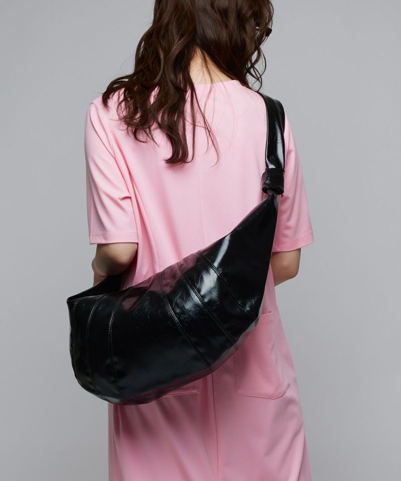 光沢感のある大容量収納クロスショルダーバッグ。ショルダー部分を太めに設定されていることで負担軽減されます。幅広いコーデに合わせやすいシンプルなデザイン。