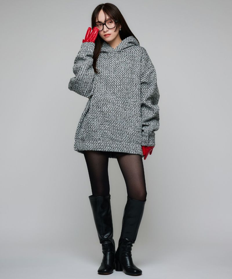 上品な印象のツイード素材をカジュアルな雰囲気のパーカー型に落とし込んだデザイン。トレンドライクなゆとりのあるオーバーシルエットがヒップまでかかる絶妙な丈感で、様々なボトムスとバランスよくコーデが楽しめます。ポケット付き・袖口・裾にはゴム入りで機能性◎