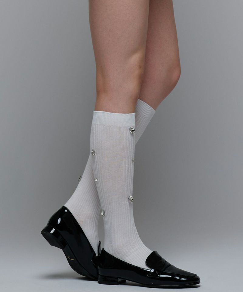 サイズの異なるビジューが輝くラグジュアリーなデザインソックス。着用しやすいさらっとした生地で、伸縮性のあるリブデザイン。足元を華やかにしてくれるアイテム。※洗濯は手洗いを推奨しております。