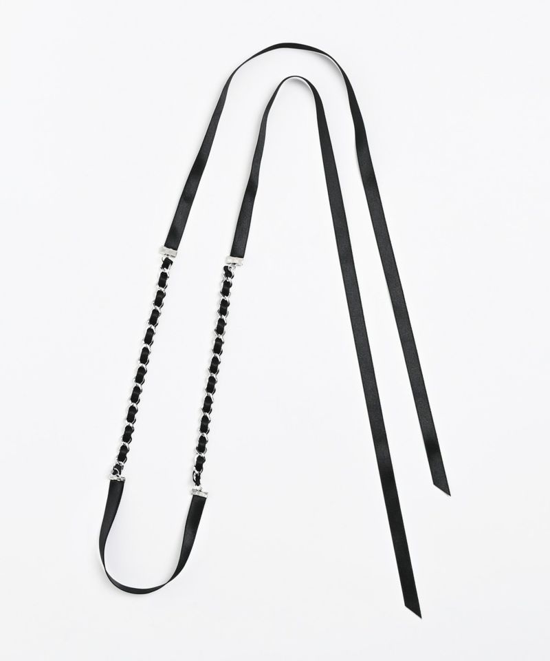 チェーンとリボンを組み合わせたファッションベルト。シンプルなボトムから、柄物までマルチに使えるデザイン。スタイリングにプラスするだけで、女性らしさを引き立たせてくれるアイテム。