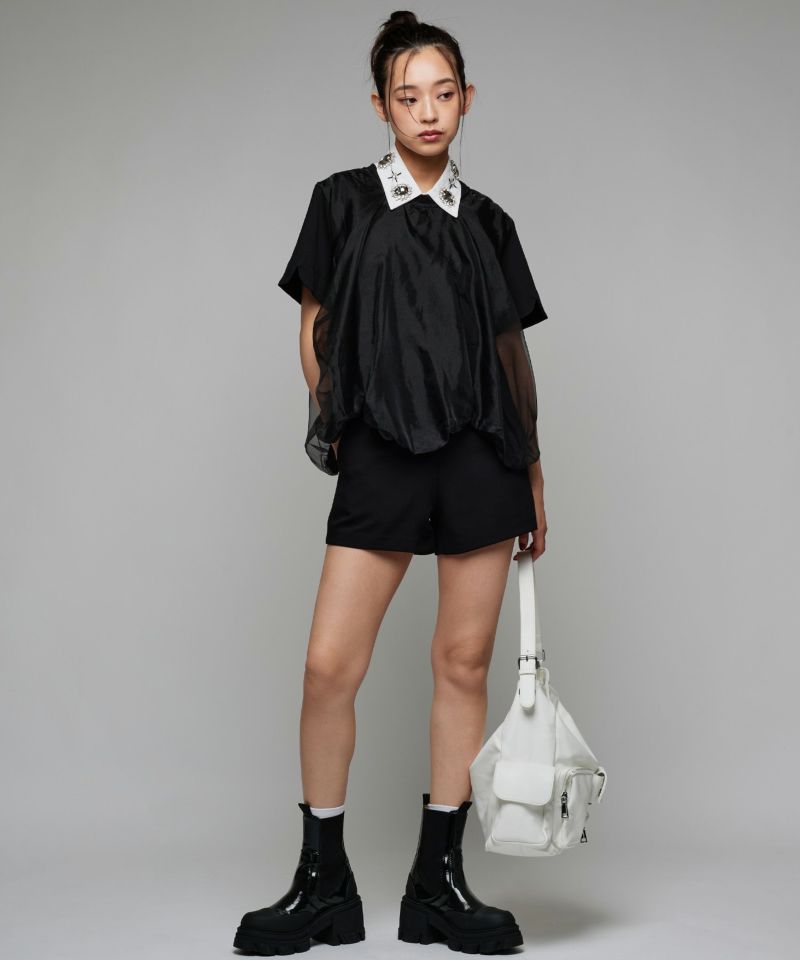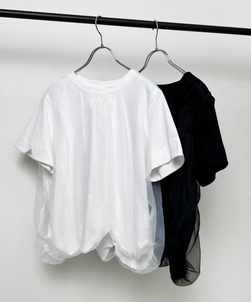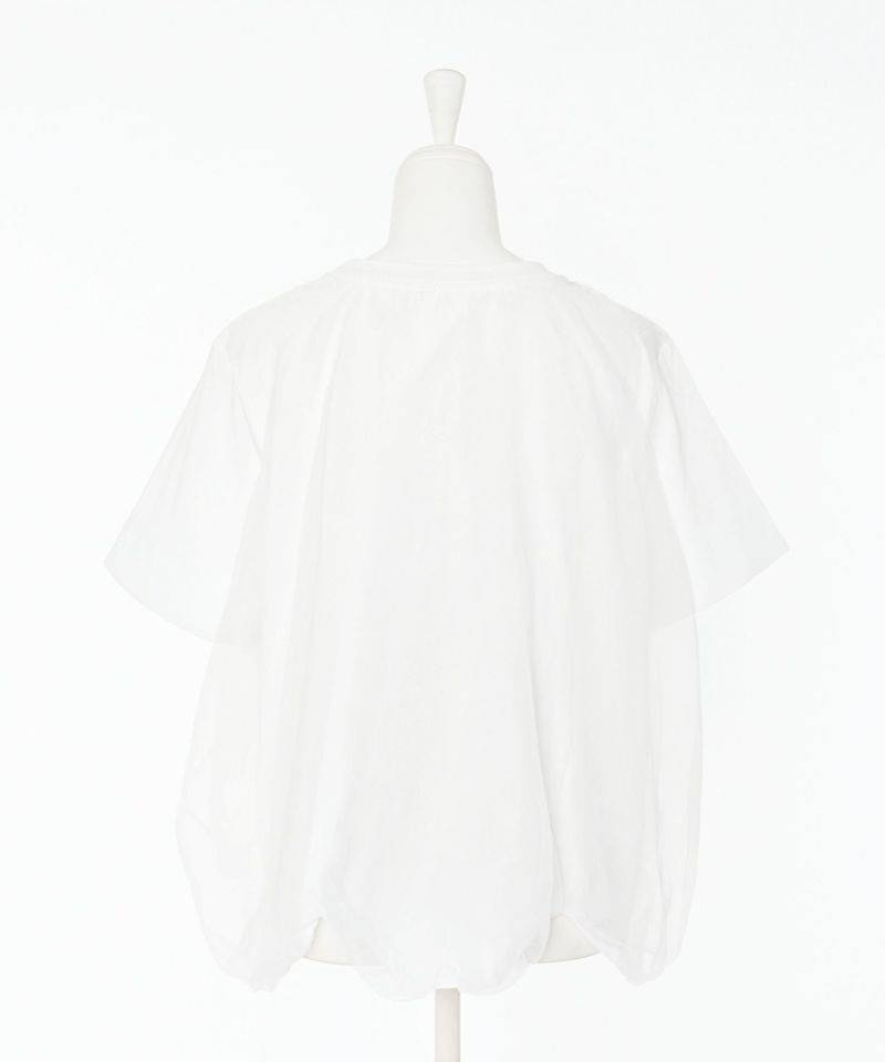 Tシャツの身頃にオーガンジー素材をドッキングさせ、丸みのあるバルーンシルエットに仕上げたトップス。裾が他にはない独特なディティールで、袖口にさりげないスリットデザインを施しています。ボリュームのあるデザインになっているので、タイトめなボトムスと相性◎【model】H163 B78 H84