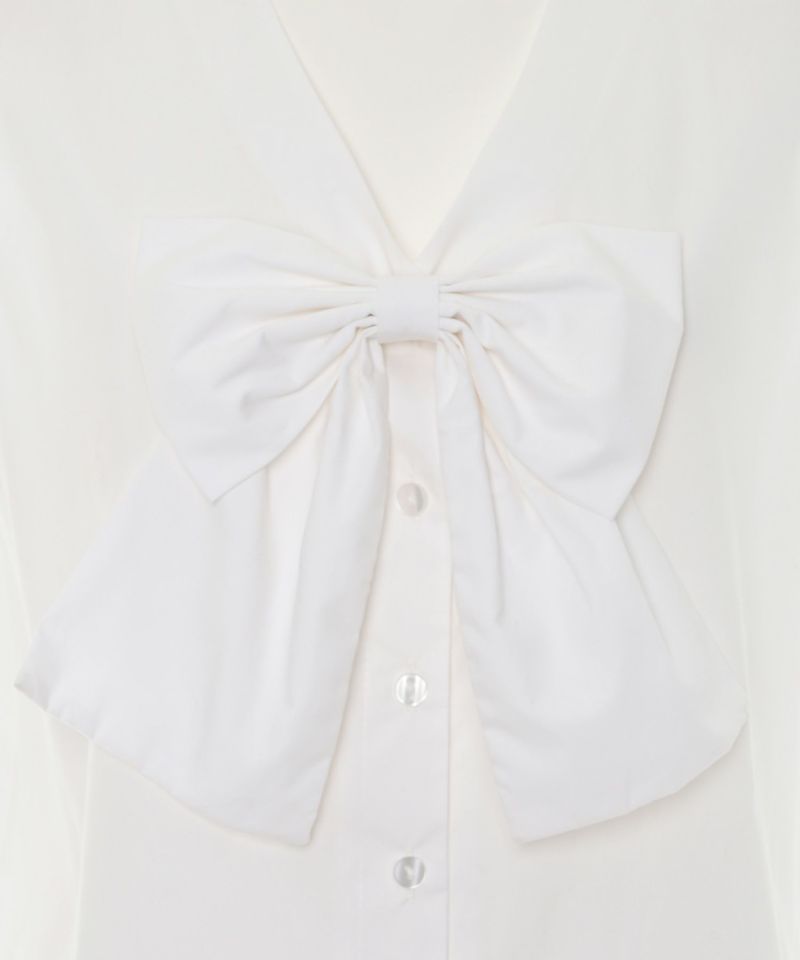 大きなフロントリボンが存在感抜群のノースリーブブラウス。リボンは安全ピンになっており取り外し可能。ボックスシルエットとVネックが抜け感を演出し、これからの季節にピッタリのアイテム。 【model】H165 B78 H83 / H163 B78 H84