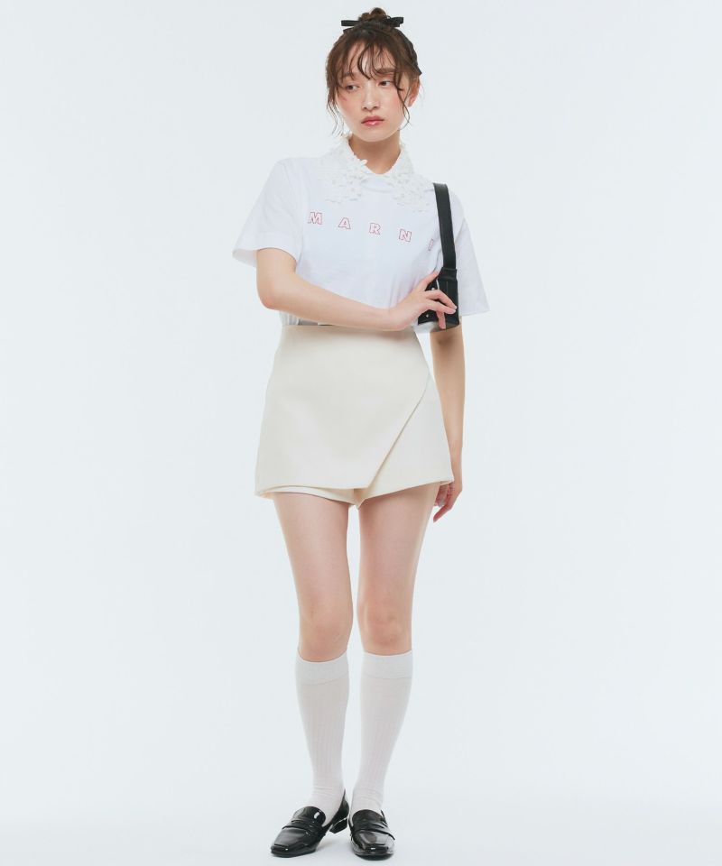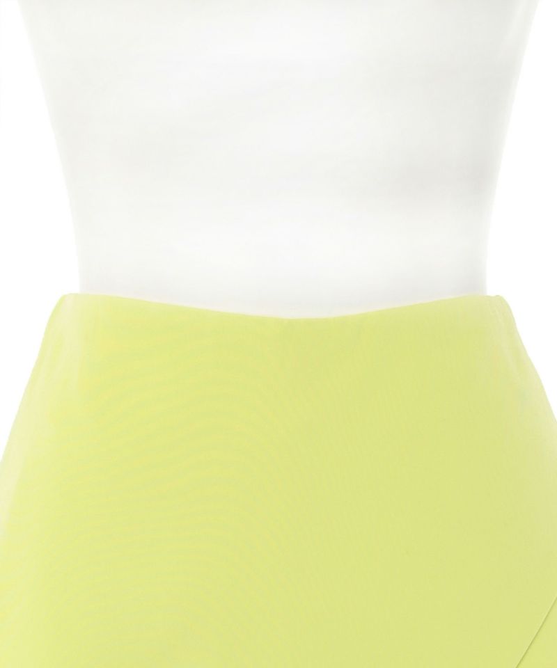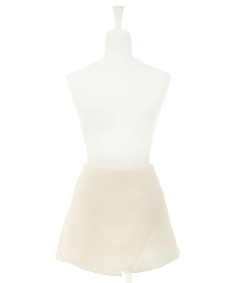 フロントがアシメデザインになったショートパンツ。ラップスカートに見えるデザインと程よくAラインのシルエットが脚長効果抜群。シンプルなトップス合わせでも一癖あるコーディネートに。【model】H165 B78 H83 / H160 B80 H85
