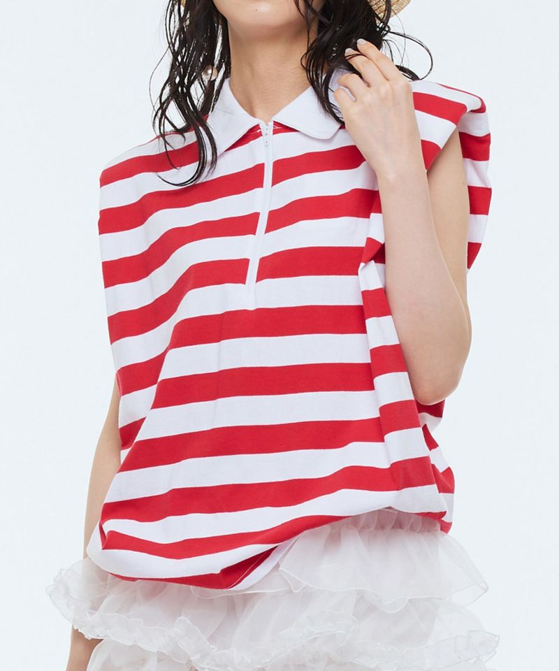 トレンドのボーダー柄のマリン風トップス。フロントのハーフジップのディティールがスタイリッシュな印象に。肩パッド入りのフレンチスリーブで二の腕が細く見えるのも嬉しいポイント。