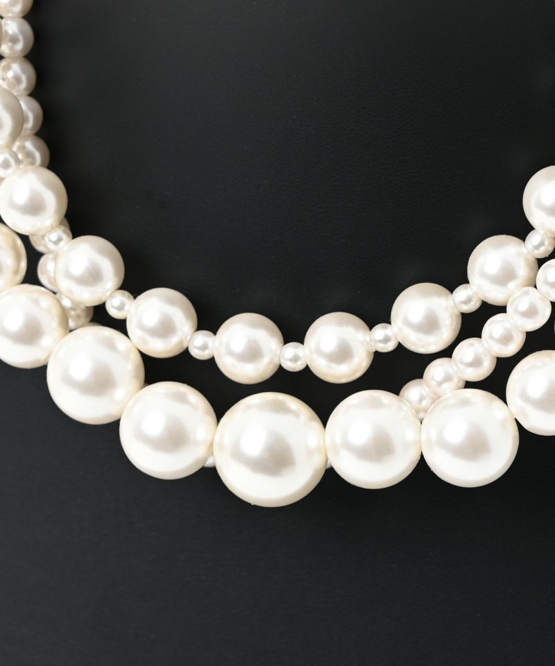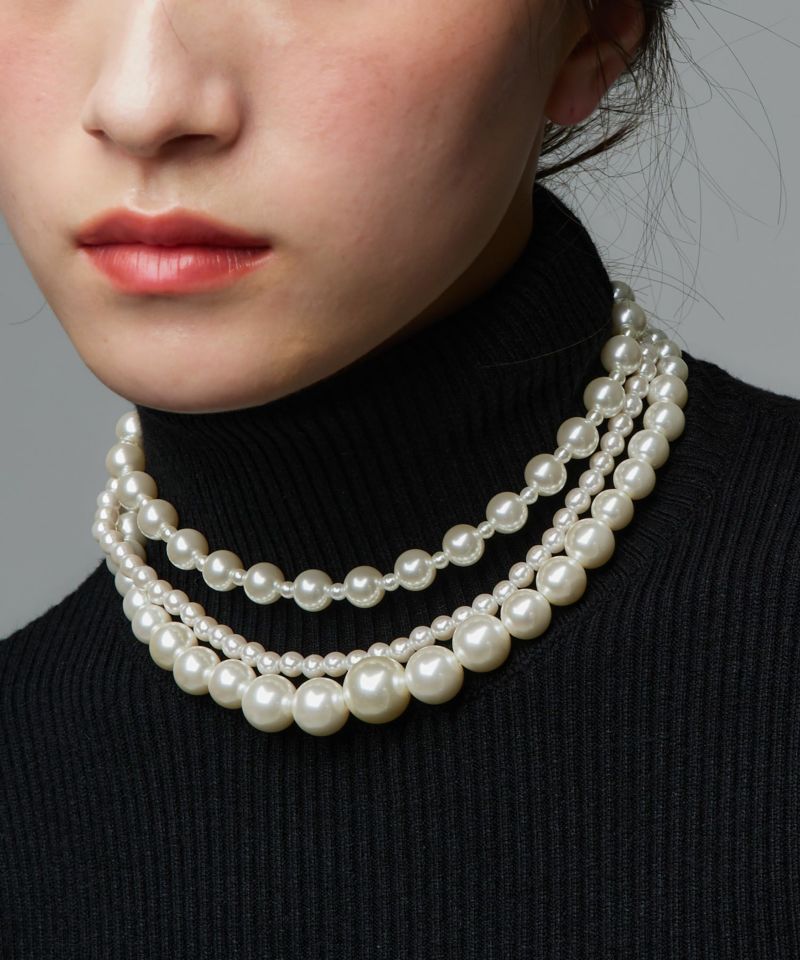 大きさの異なる上品なパールネックレスが3連になったネックレス。オケージョンスタイルにはもちろん、カジュアルなロゴTシャツなどに合わせると一気に大人っぽくブラッシュアップしてくれるトレンドアイテム。
