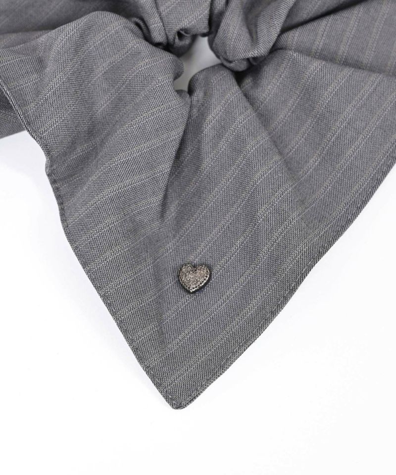 スクエア形に仕上げたシュシュ。カラー毎に素材感が違い、ブラックカラーは光沢感のあるつるっとした質感で、グレーはストライプデザインが目を惹くサラッとした質感を採用。印象的なシルエットでありながら、普段のスタイリングに馴染みやすいデザインで大人可愛く今らしいヘアアレンジに。※ブラックにはメタル素材のハートモチーフ付いておりません。