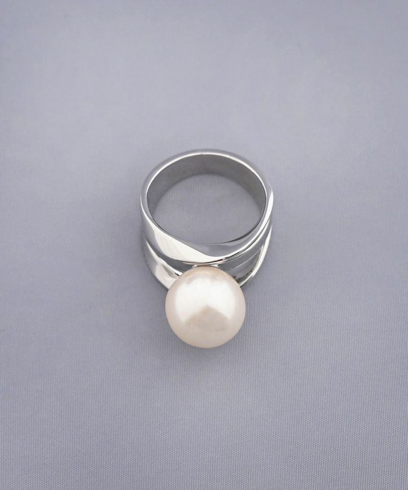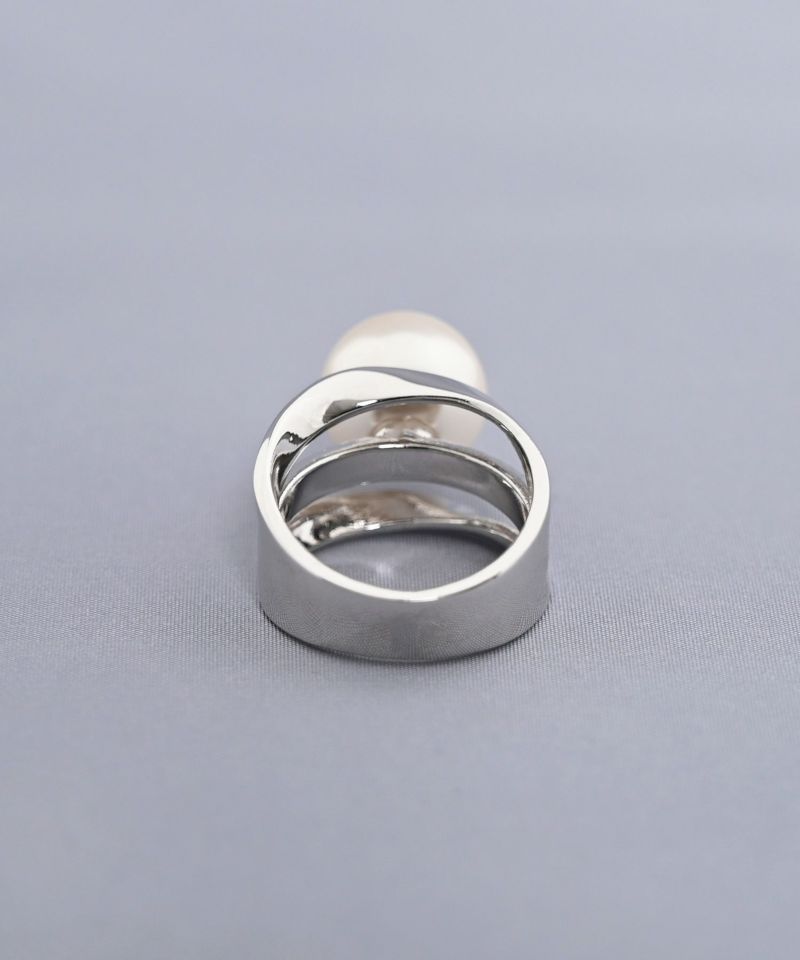 リング部分のゆるやかなラインと抜けのあるデザインが、太めのリング幅をすっきりとした印象に仕上げてくれるので、重たくみえないのが嬉しいポイント。立体的なフォルムがパールとシルバーの落ち着いた雰囲気を引き立て、シンプルながらもほかのアクセサリーとは違った雰囲気を添えてくれます。
