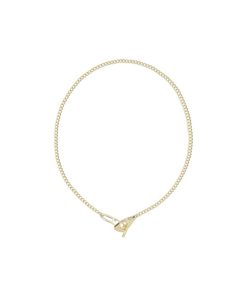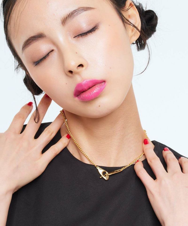 一見シンプルながらも、ほんのりと遊び心のあるチェーンネックレス。繊細なチェーンと細いラインが上品な印象に。
