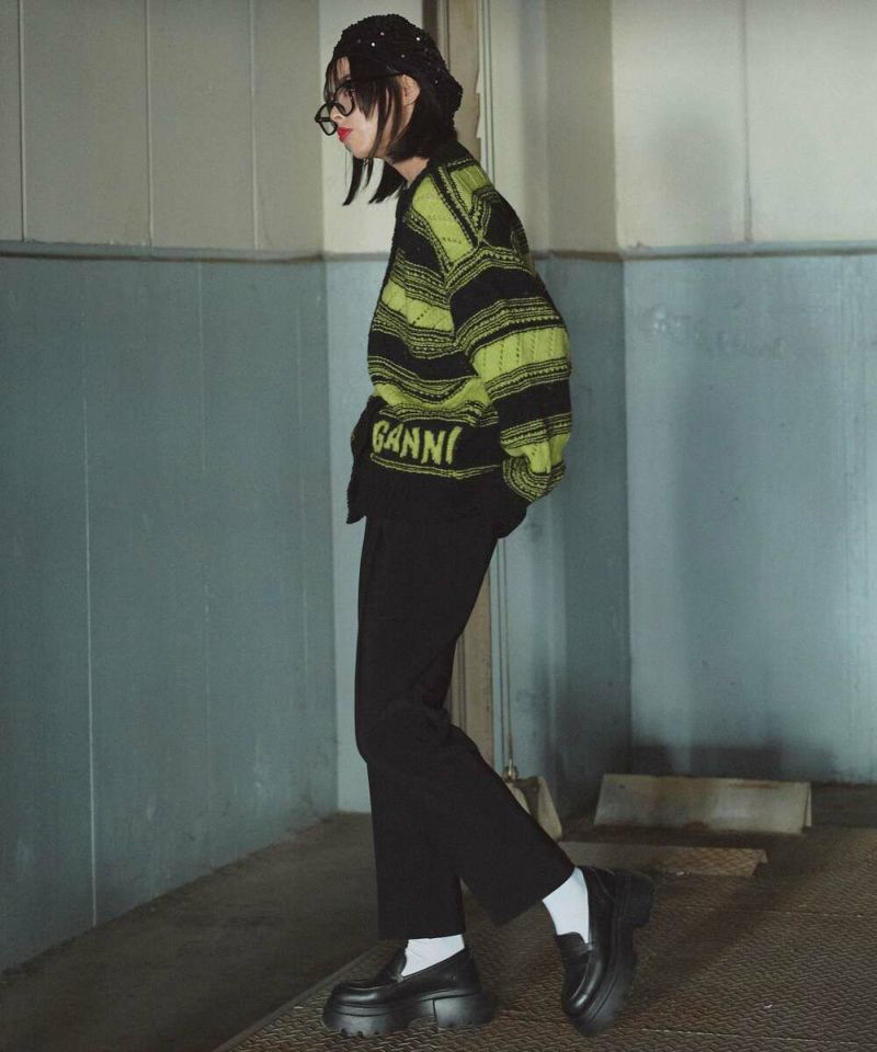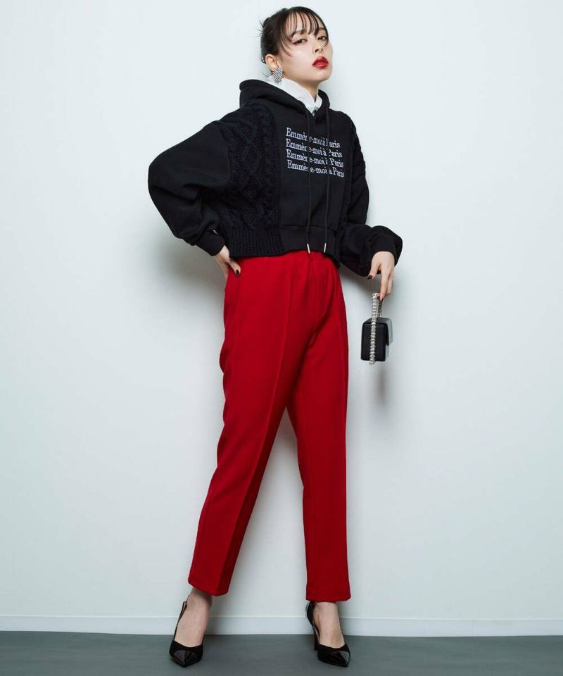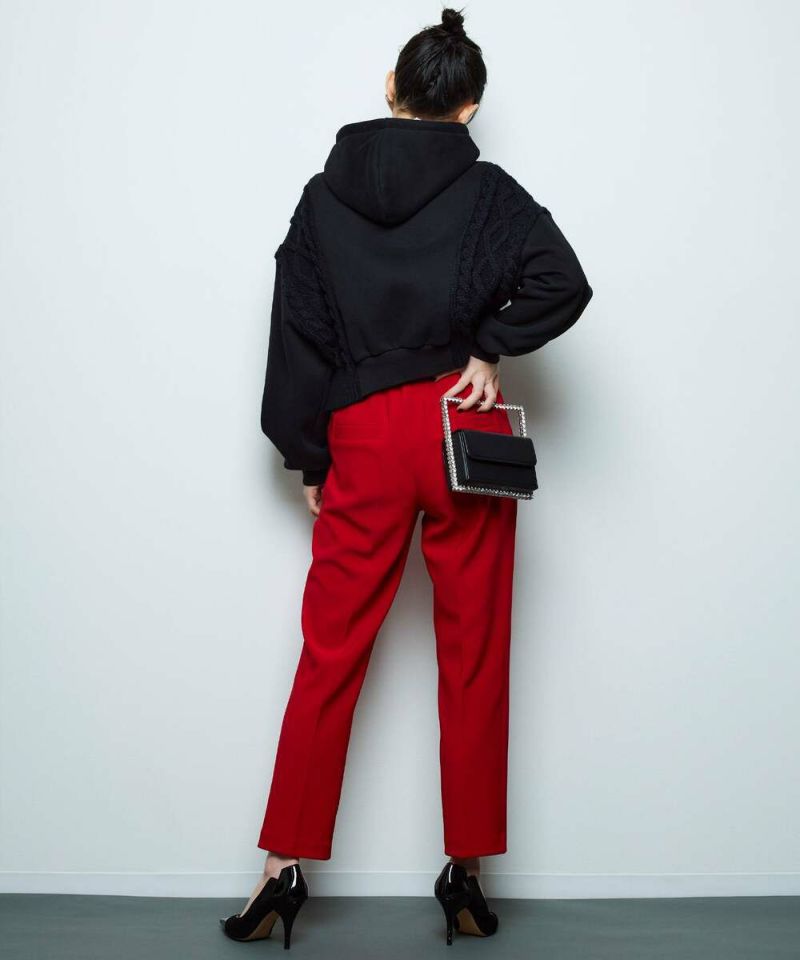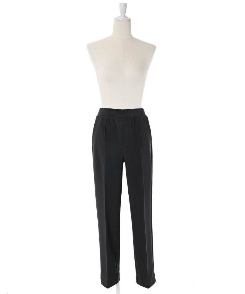 前後にセンタープレスが入っていることで脚が立体的に見え、スタイルアップ効果のあるテーパードパンツ。ストレスフリーに着用できるようウエスト部分にゴムを使用。肌寒い季節に嬉しい裏起毛を採用してます。【model】H165 B78 H83