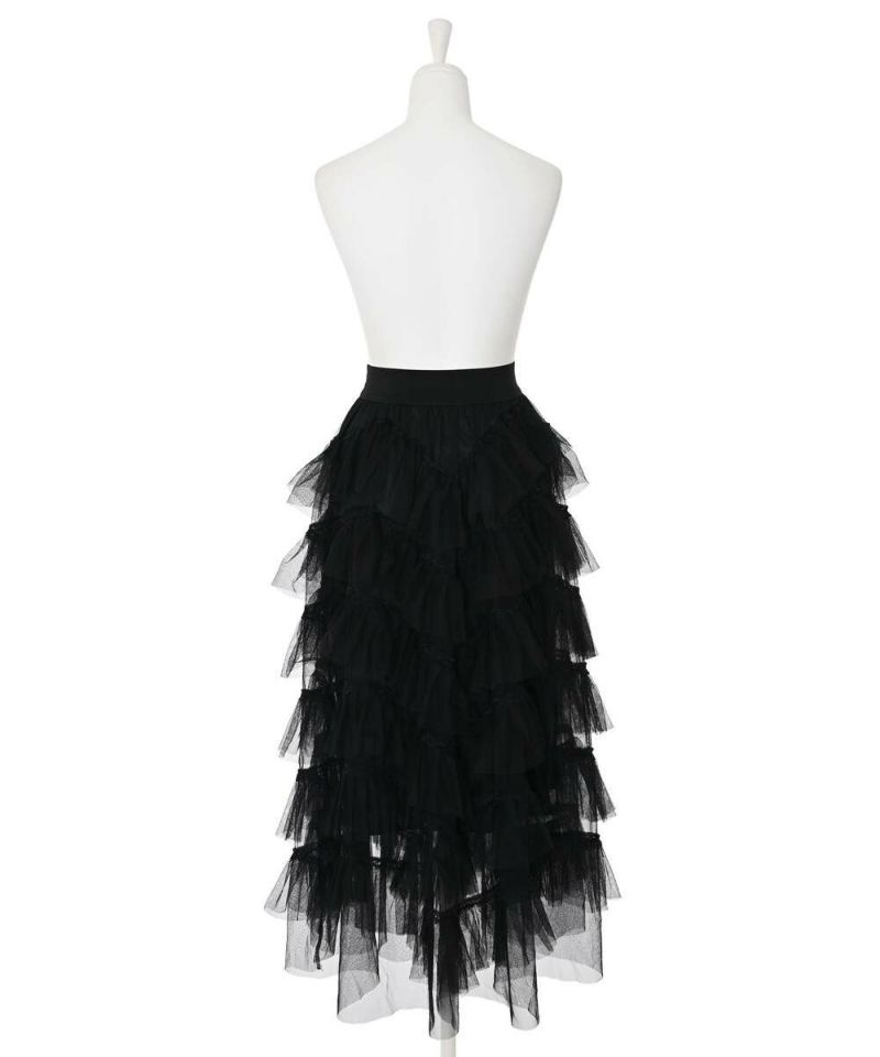 細かいティアードデザインがフェミニンなチュールスカート。チュールを重ねることで立体感が生まれ、歩くたび動きの出るデザイン。ボリューム感のあるシルエットで甘くなりすぎず、モードな印象に。 【model】:H165 B78 H83 / H163 B78 H84