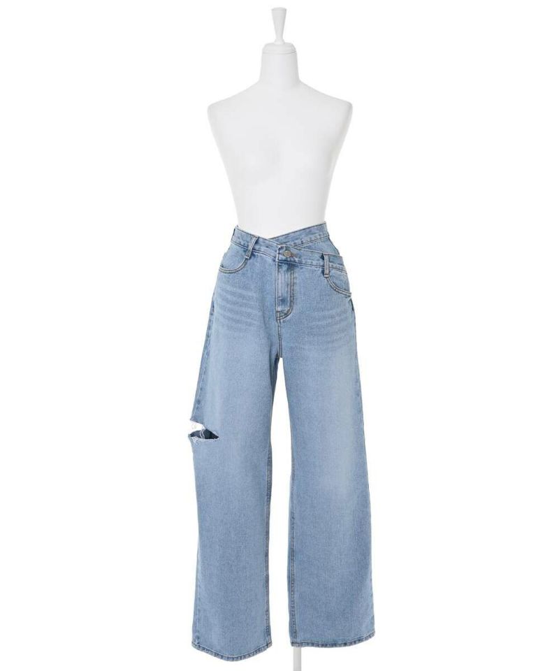 ウエスト部分がアシンメトリーでクロスデザインになったハイウエストデニム。浅めのカットデザインが、さりげない肌見せとなり安心して着用可能。裾にかけて程よくゆとりのあるサイズ感が魅力。※デニムのお色味は、ワンウォッシュデニムとなるため、バックタグにヴィンテージ感がございます。ご了承ください。【model】H156H165 B78 H83