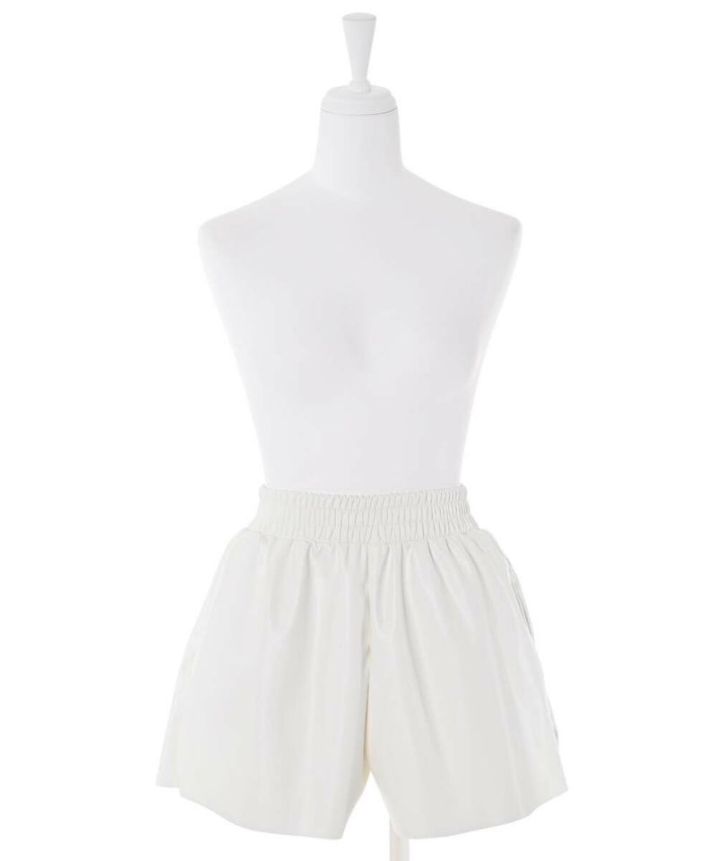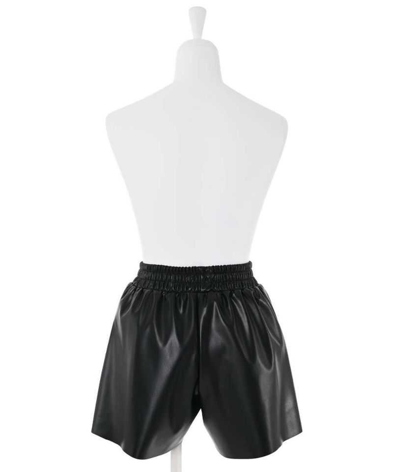光沢のあるフェイクレザーを使用したショートパンツ。 ウエストの幅広いゴムシャーリングがストレスフリーに着用でき、ポケット付きで機能性も◎ 薄手でコンパクトなサイズ感なので、インナーパンツとしても着用可能。 秋冬にはタイツ合わせ等でシーズンライクに着用でき、春先までロングシーズン活躍するアイテム。【model】H156H163 B78 H84