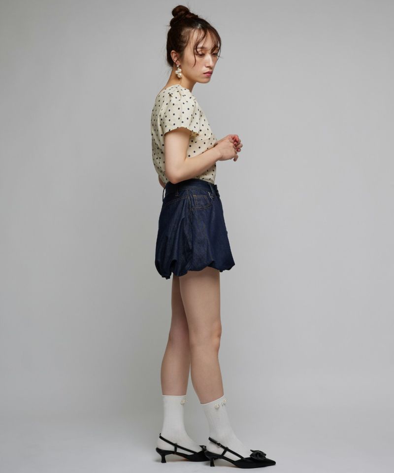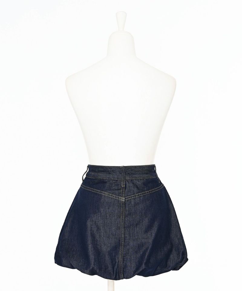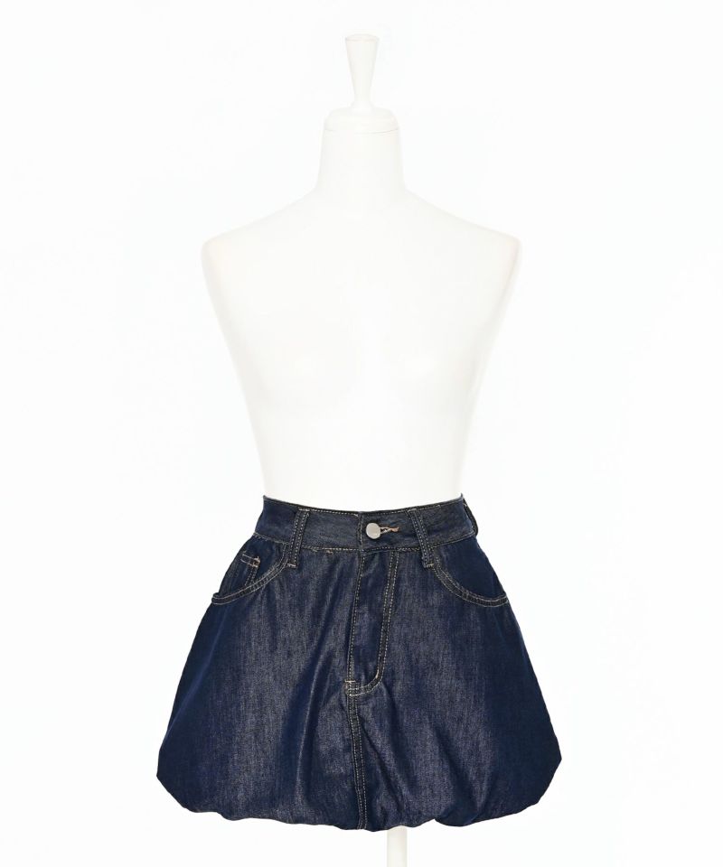 トレンドのバルーンシルエットにデニム素材を落とし込んだミニスカート。デニム素材でカジュアルな中に、丸みのあるフォルムで抜け感も愛らしさもアピール。ミニ丈ですが、インナーパンツ付きで安心して着用できます。Tシャツ合わせでカジュアルスタイルはもちろん、ブラウスなどでフェミニンスタイルにもピッタリ。【model】H160 B80 H85