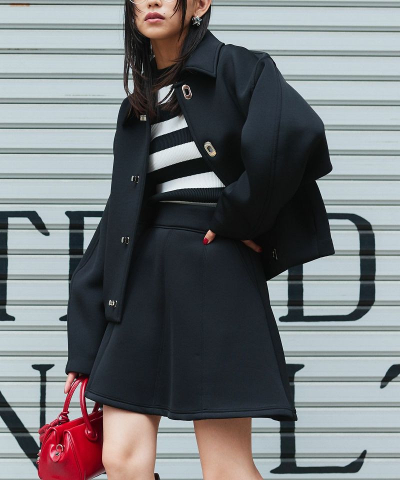 Tシャツ合わせで着用していただくのはもちろん、薄手のニットをレイヤードしていただくのも◎オーバーサイズのカーディガンやスウェットとも好相性で、カジュアルからきれいめまで幅広く活躍する万能スカート。同素材で作られたボンディングジャケット(25AWNCO015)と合わせてセットアップでの着用もおすすめです。