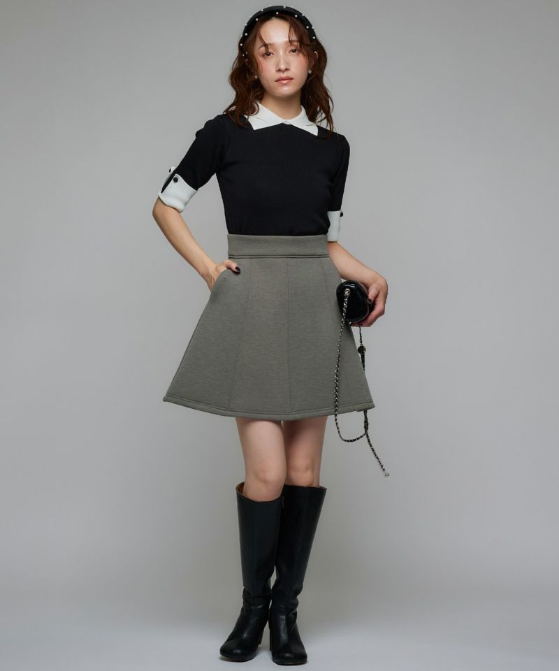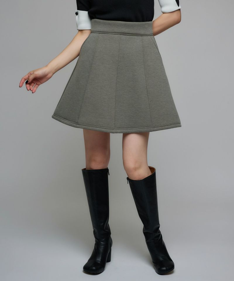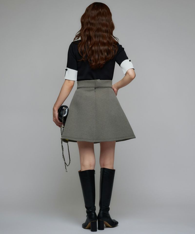 程よいフレアシルエットが腰回りをさりげなくカバーしつつ、フロントの切り替えとハイウエストデザインでスタイルアップを叶える一枚。サイドには便利なポケットを備え、スナップボタンとファスナーで着脱もスムーズです。さらに、裏地にはカラー配色を施し、フェミニンさに遊び心をプラスしました。また、インナーパンツ付きのデザインの為、快適さと品のある見え感を両立します。