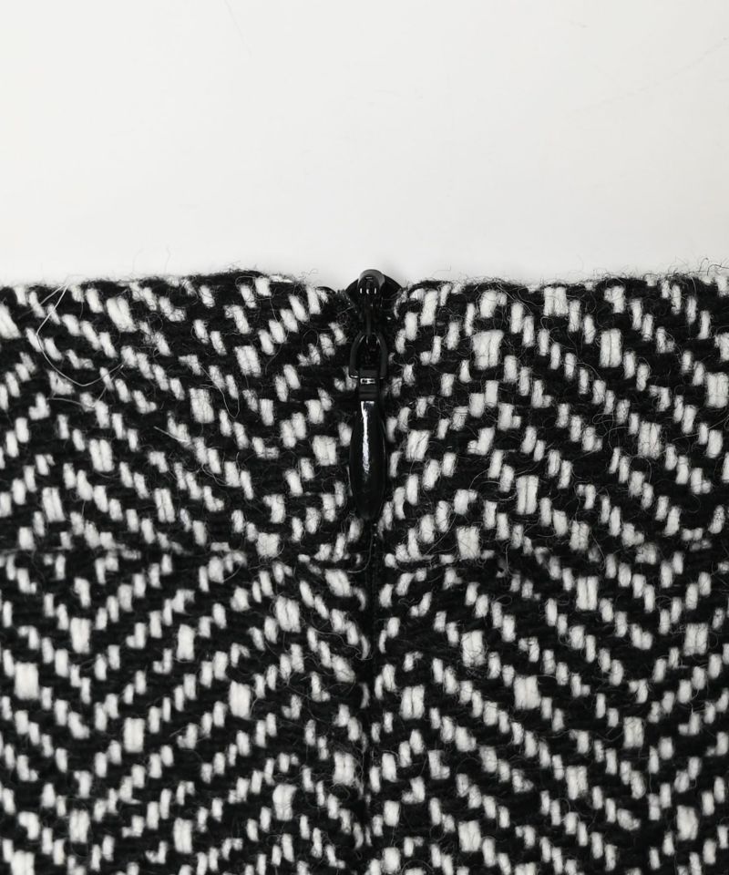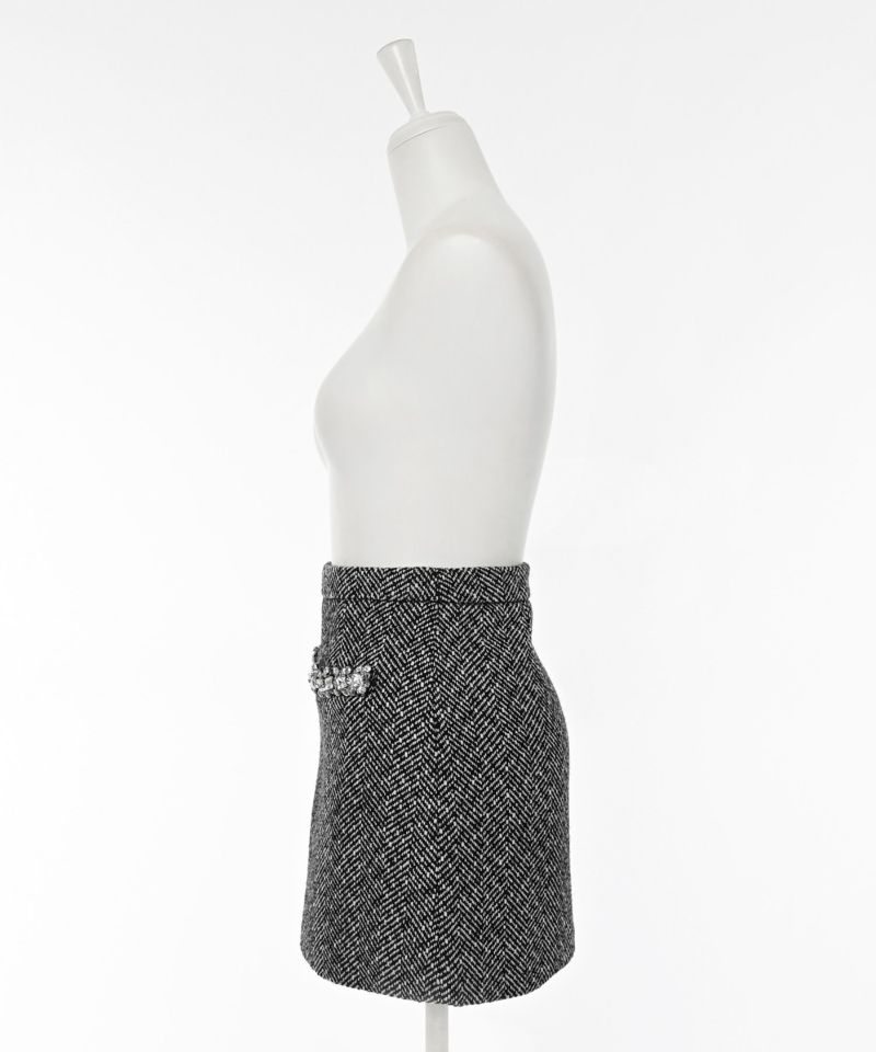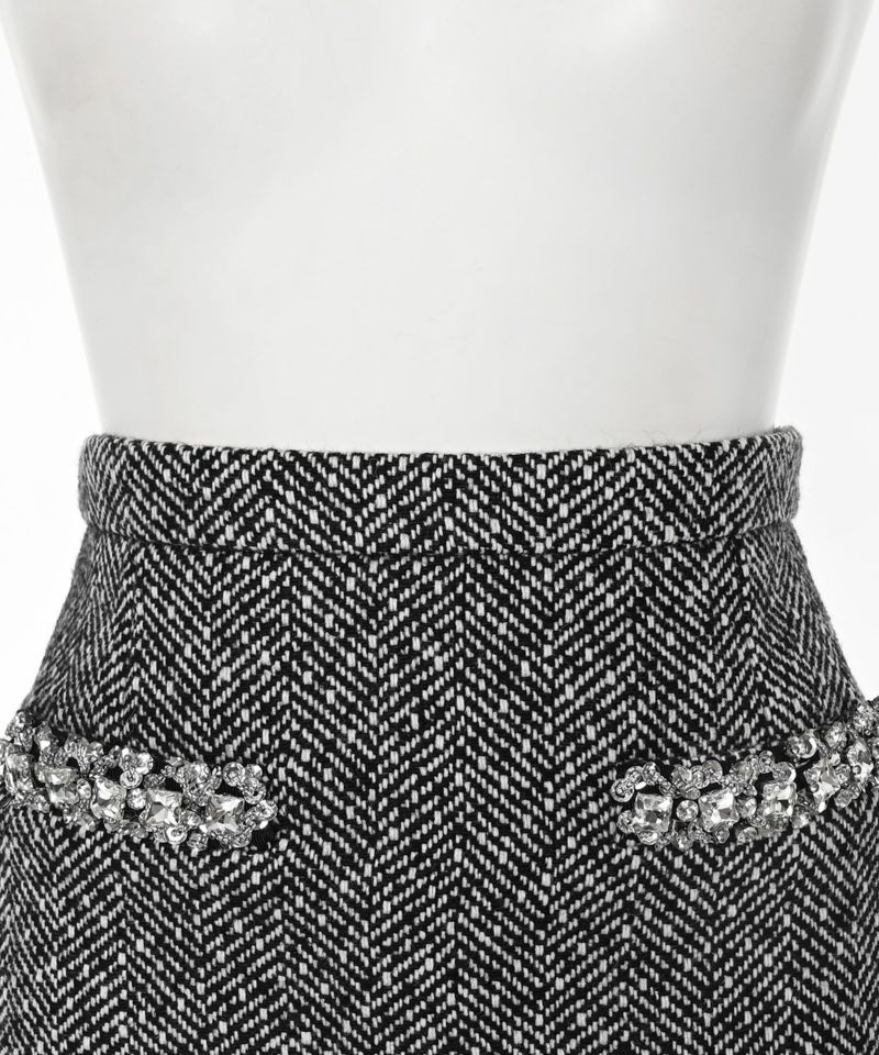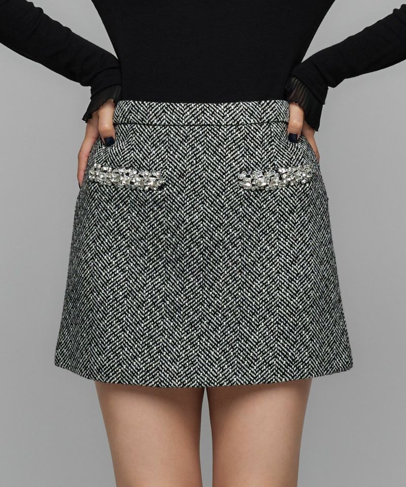 フェイクポケットの縁にあしらわれたビジューが、洗練された輝きを放つスカート。シンプルな中にモードなアクセントを添え、コーディネートを一気に格上げします。