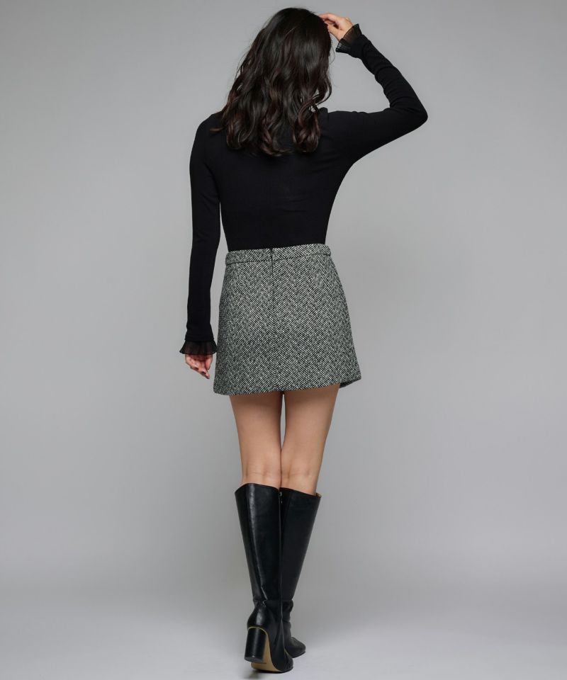 腰回りにすっきりとフィットする台形シルエットが特徴のミニスカート。ハイウエスト仕様で足長効果を引き出し、スタイルアップを叶えてくれます。落ち着いたカラーを採用しているため、ミニ丈でありながらも大人っぽく上品に着こなせるのも魅力。女性らしさとモード感を兼ね備え、幅広いコーディネートに活躍する一着です。
