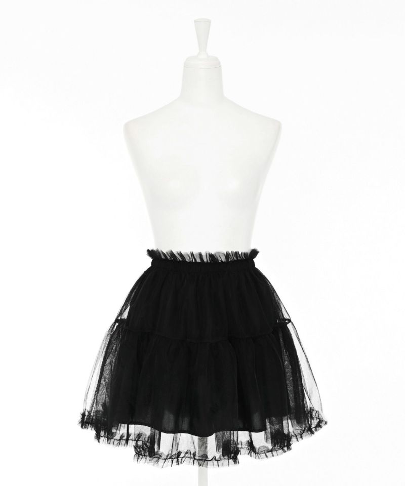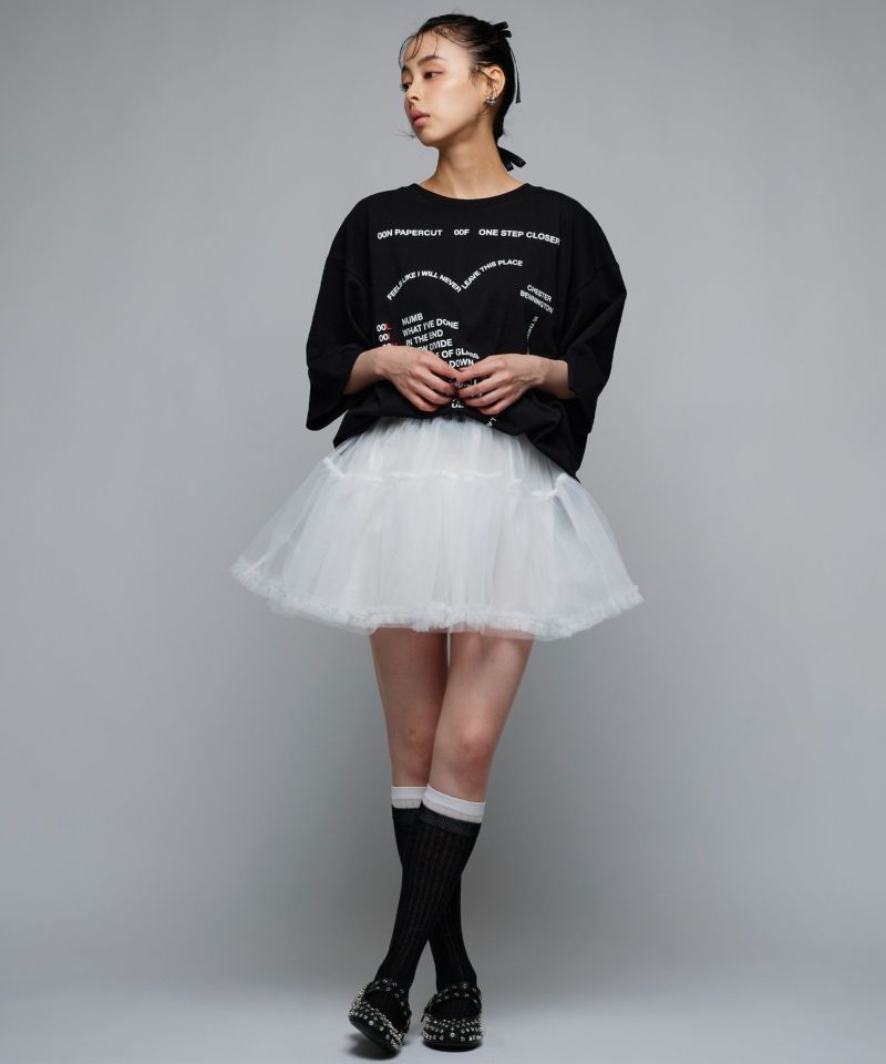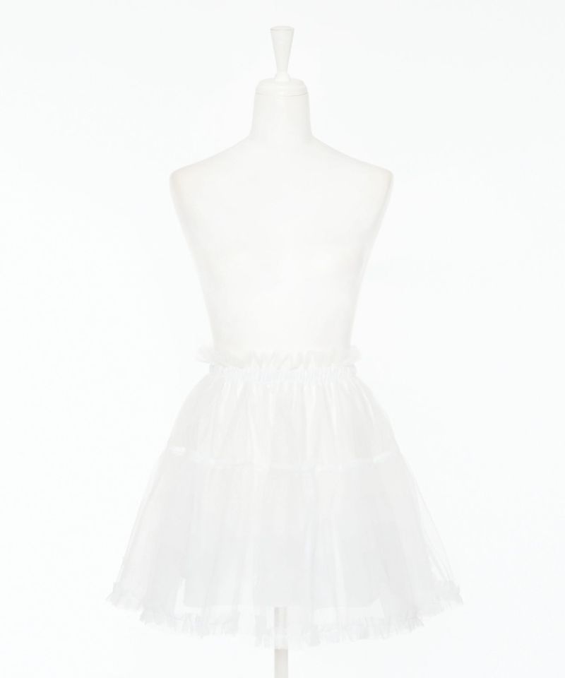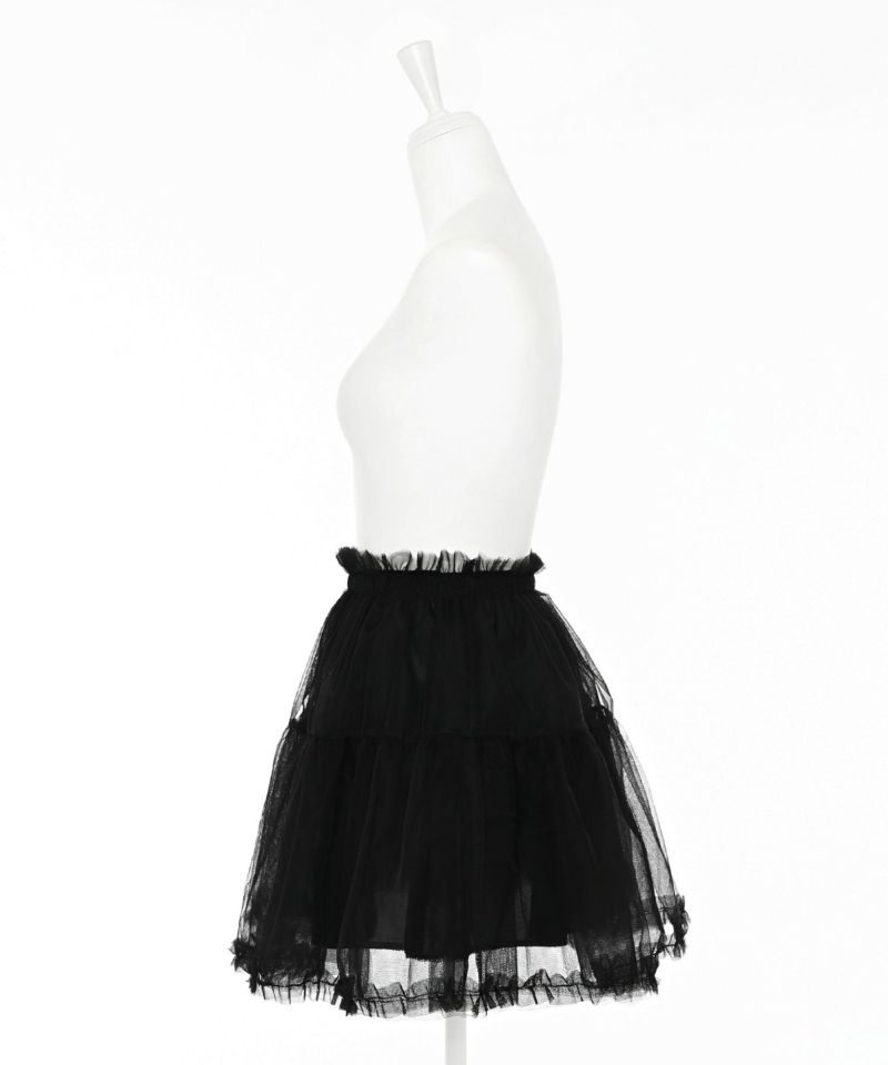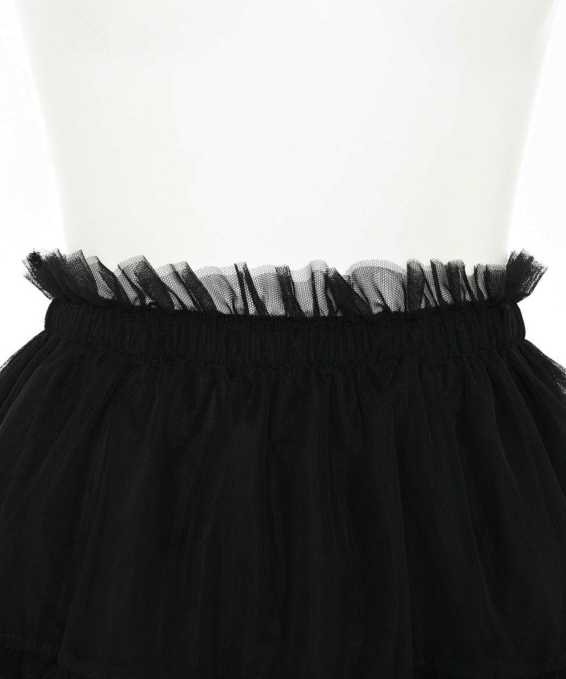 ボリュームたっぷりのシアーチュールが可愛らしいミニスカート。華奢見えを叶えるフレアシルエットで、ふわふわのチュール素材を2枚重ねてフェミニンな雰囲気をプラス。ハイウエストデザインなのでインスタイルはもちろん、アウトスタイルでチュールをチラ見せするのもオススメ。