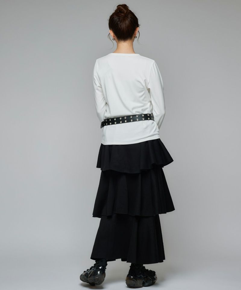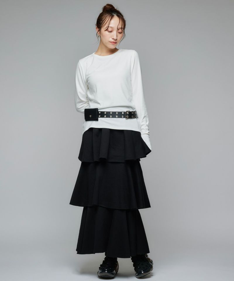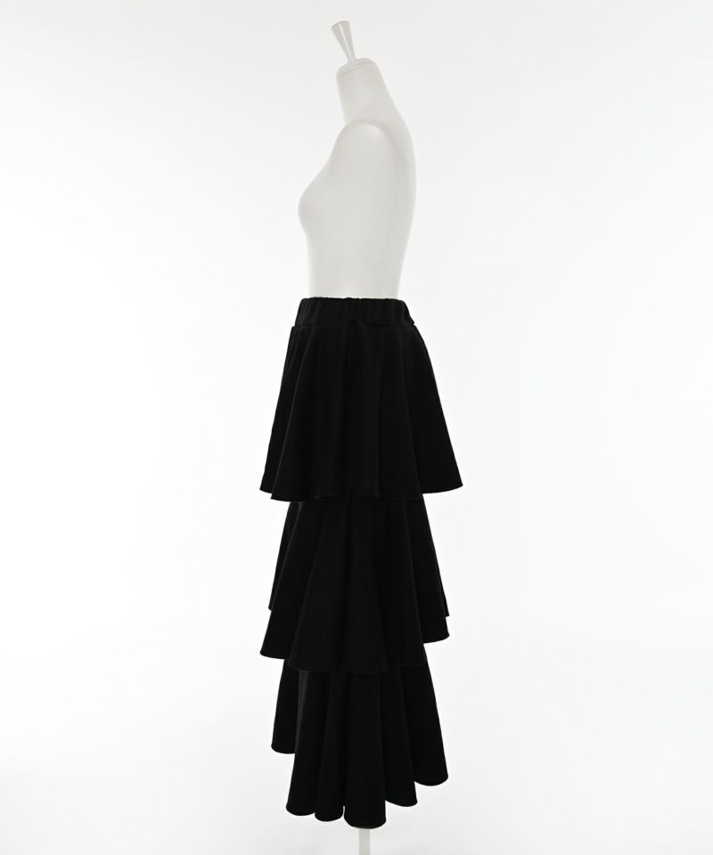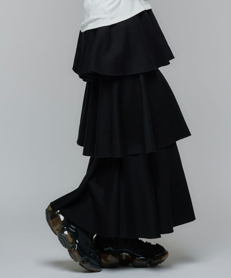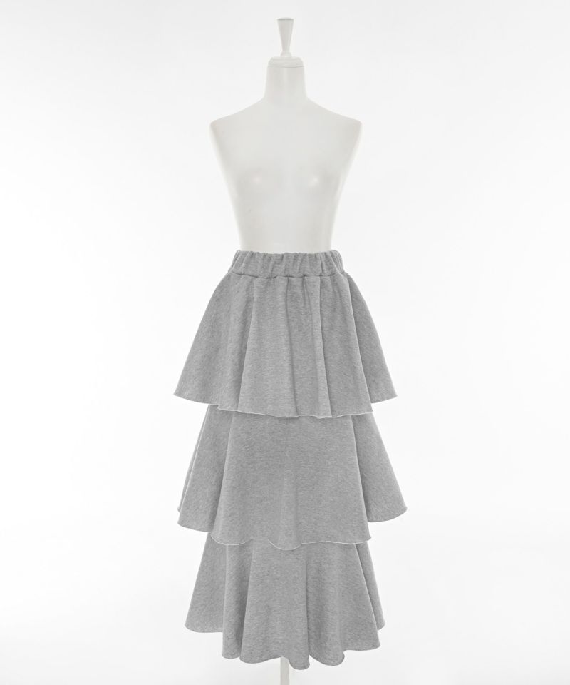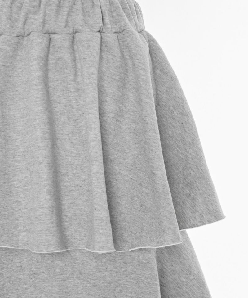 3段フリルの立体感が華やかで、動くたびにふんわりと揺れるカンカンシルエット。スウェット素材ならではの程よいカジュアルさが加わり、甘すぎずこなれた印象に。デイリー使いはもちろん、トップス次第で幅広いスタイリングを楽しめます。