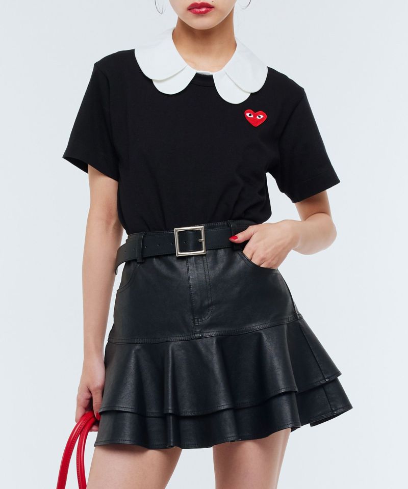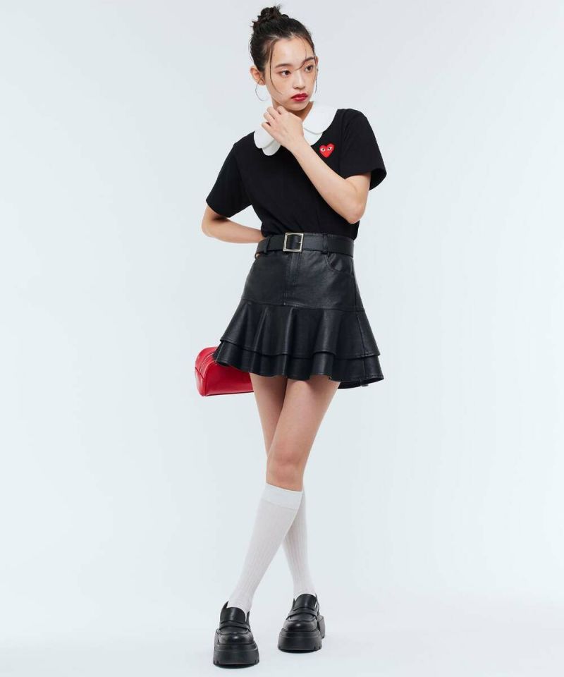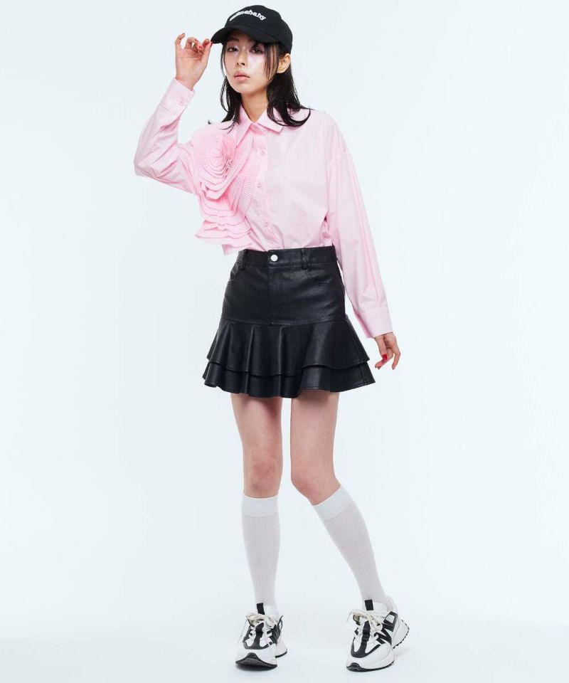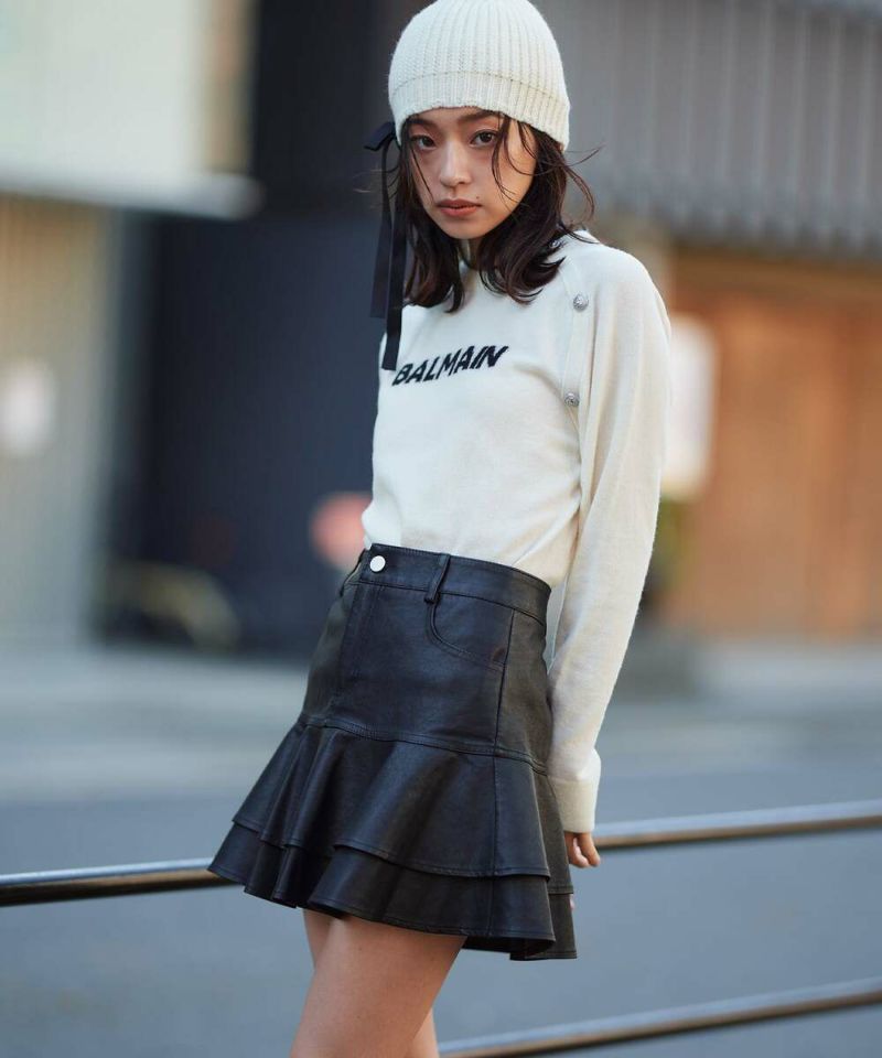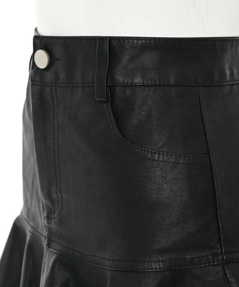 大人気のハイウエスト&フリルデザインが2重になったレザーミニスカート。 幅広いテイストのコーデに合わせられ、1枚あると重宝するアイテム。 インナーパンツ付きで、安心して着用できるのがポイント。【モデル】:H165 B78 H83 / H163 B78 H84