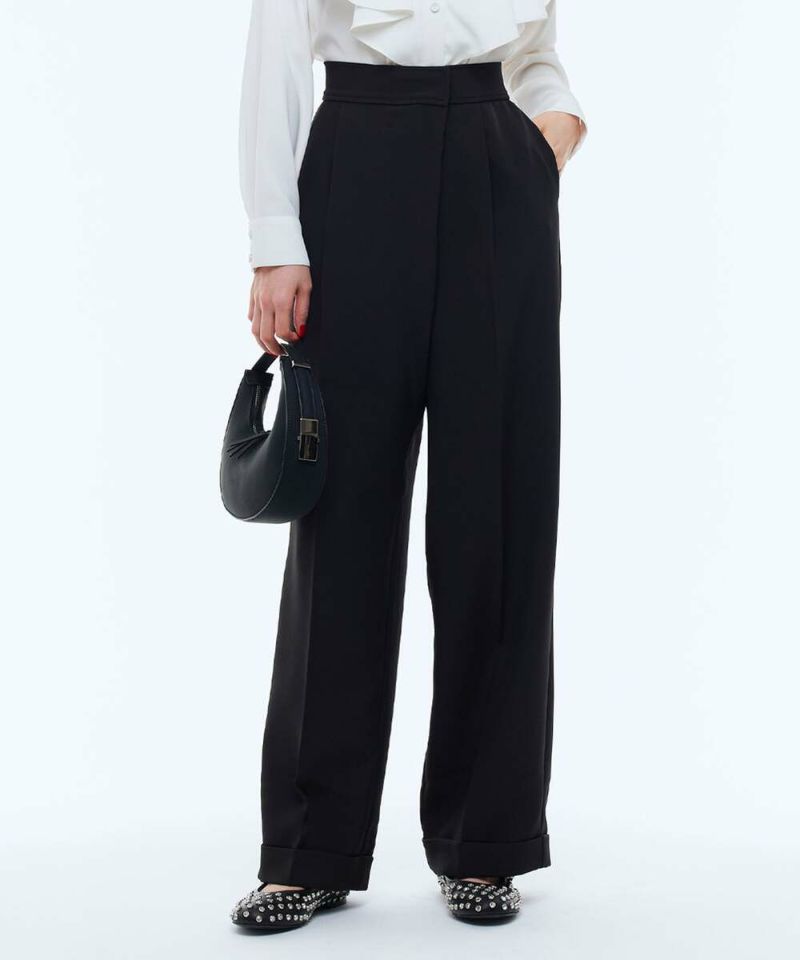 ボディーラインをカバーしてくれる余裕を持たせた筒感ながら、ストンと落ち感のあるシルエットのワイドパンツ。 流行に左右されず、シーズンレスで着用しやすいデザインは、大人のキレイめスタイルに1本は持っておきたいアイテム。 ノーカラージャケットとのセットアップスタイルがオススメです。モデル身長