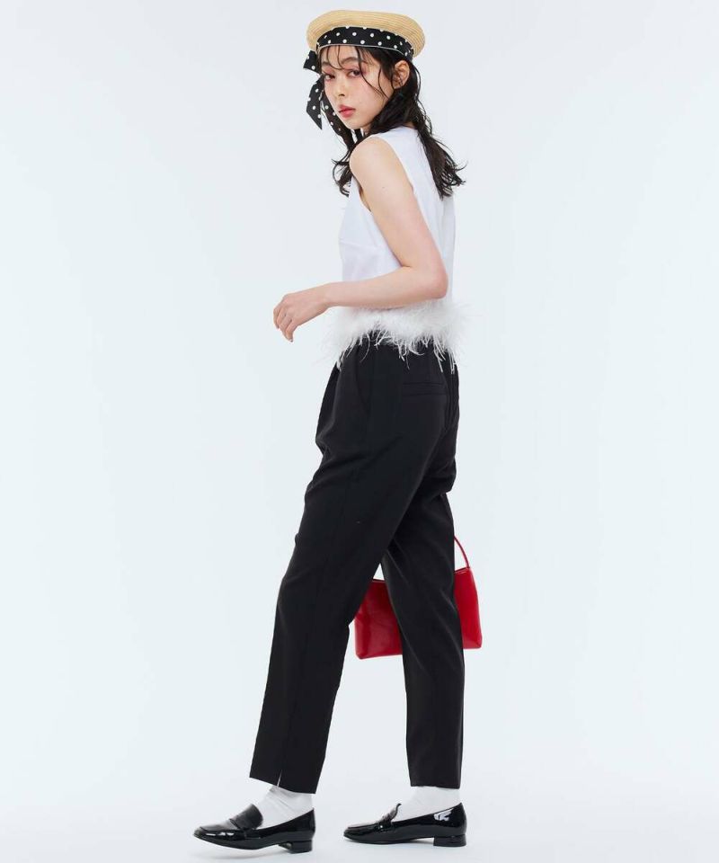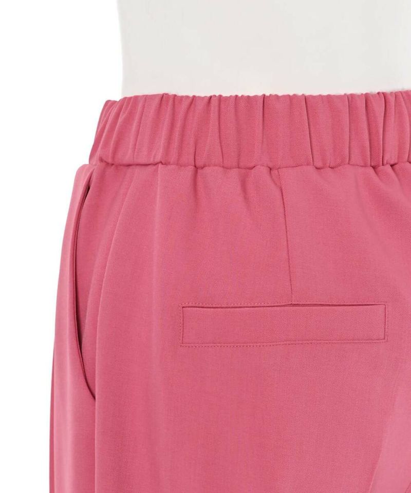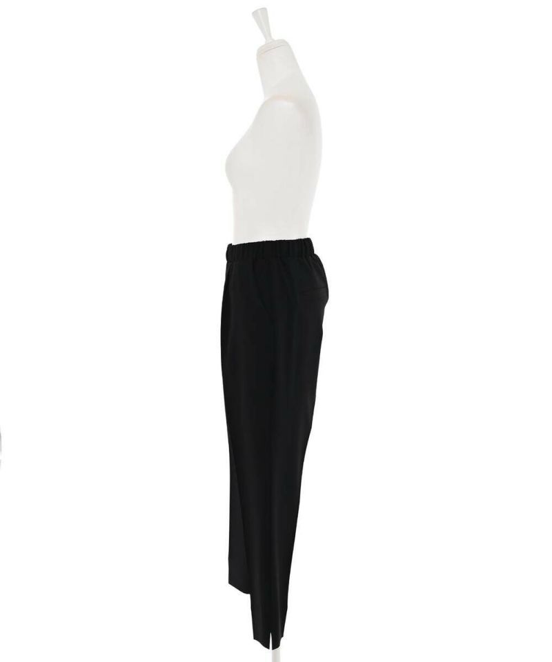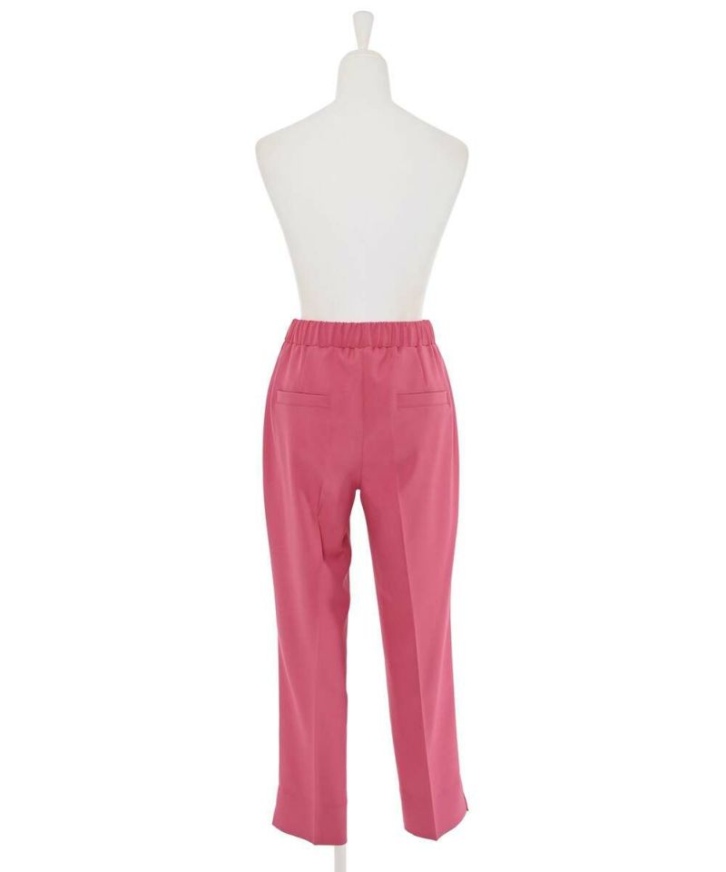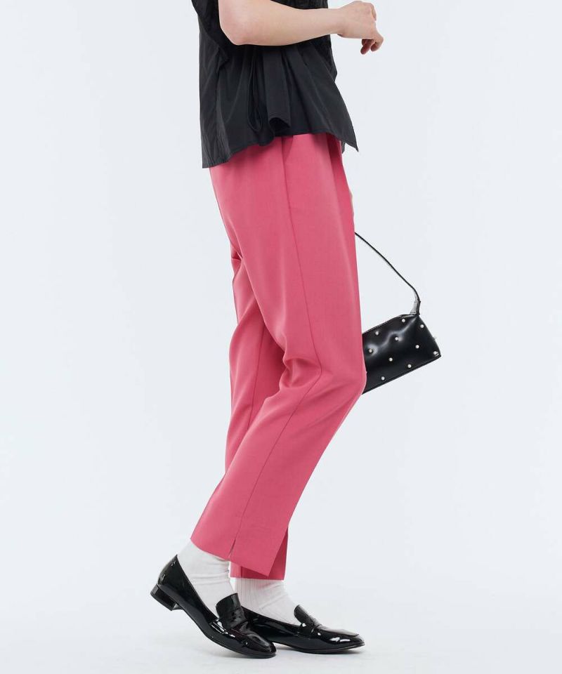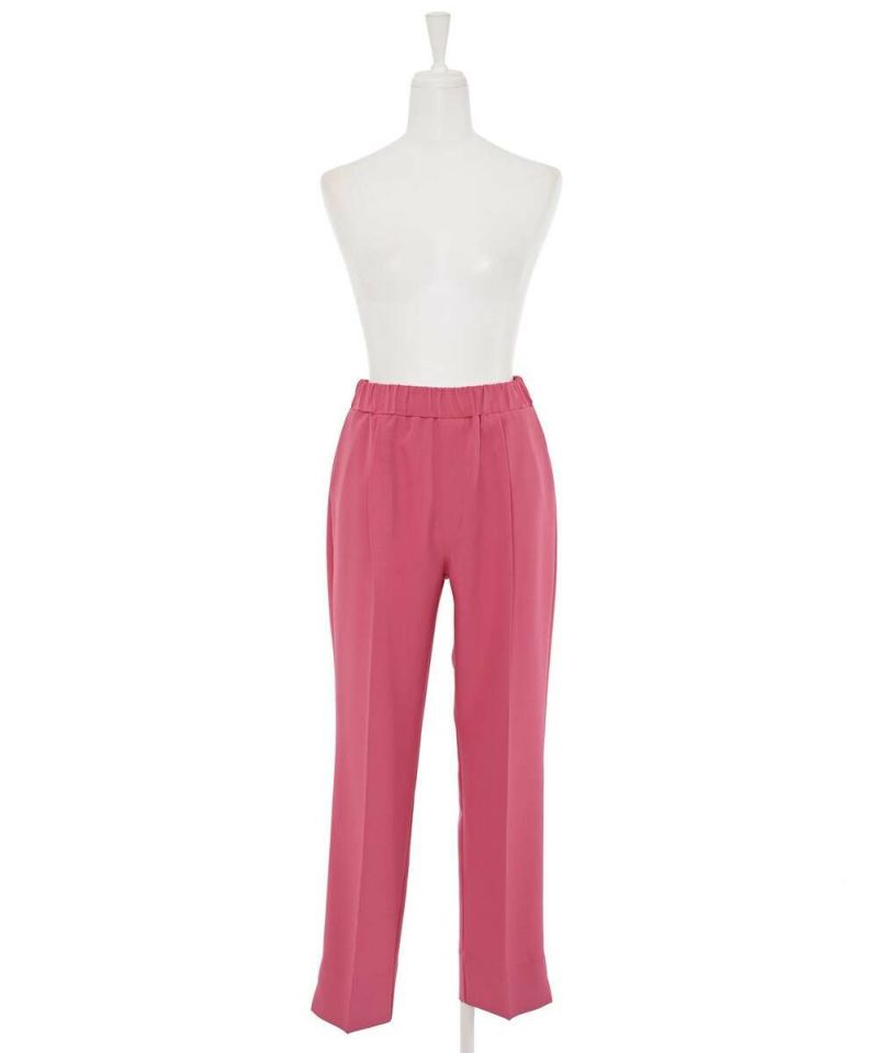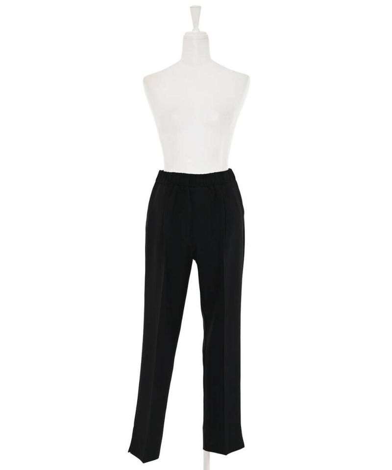 定番人気のシンプルなテーパードパンツ。カジュアルでも、綺麗めでもシーンを問わず着まわせるアイテム。ウエスト部分はゴムとリボンが付いており、風通しも良く着心地の良い万能アイテム。さりげないサイドスリットとセンタープレスが脚長効果を期待。【model】H165 B78 H83