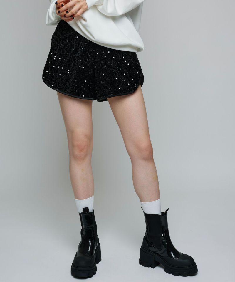 存在感のあるスパンコール素材を、スポーティムードなキックパンツデザインに落とし込んだトレンド感たっぷりのアイテム。ウエストゴムで、ストレスフリーに着用できるサイズ感も嬉しいポイント。【model】H165 B78 H83/H163 B78 H84