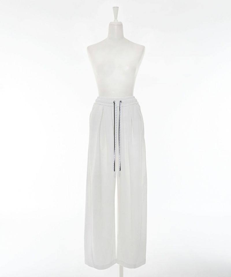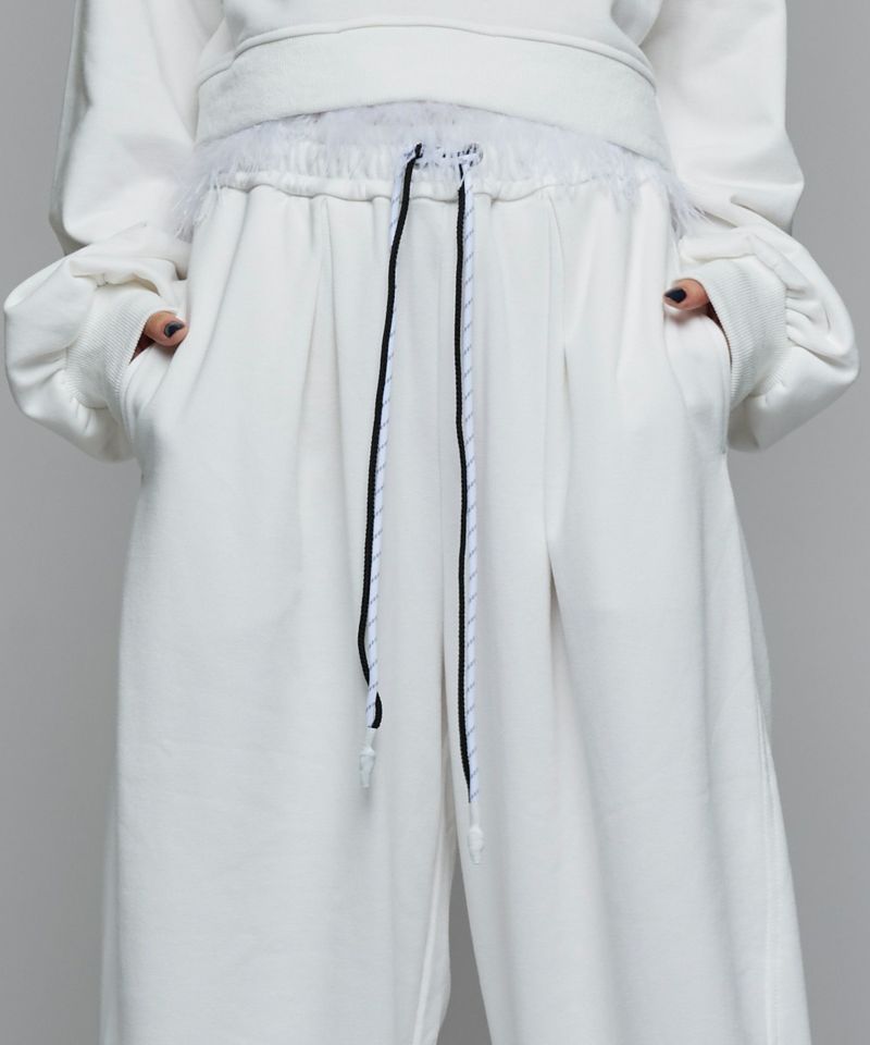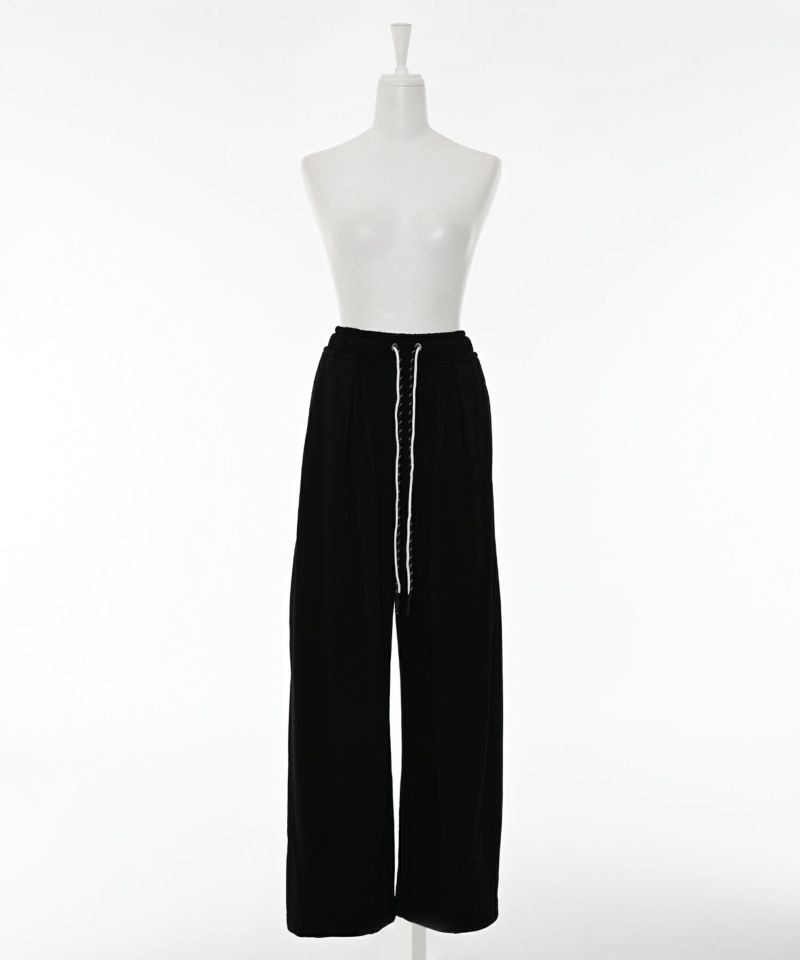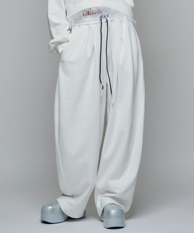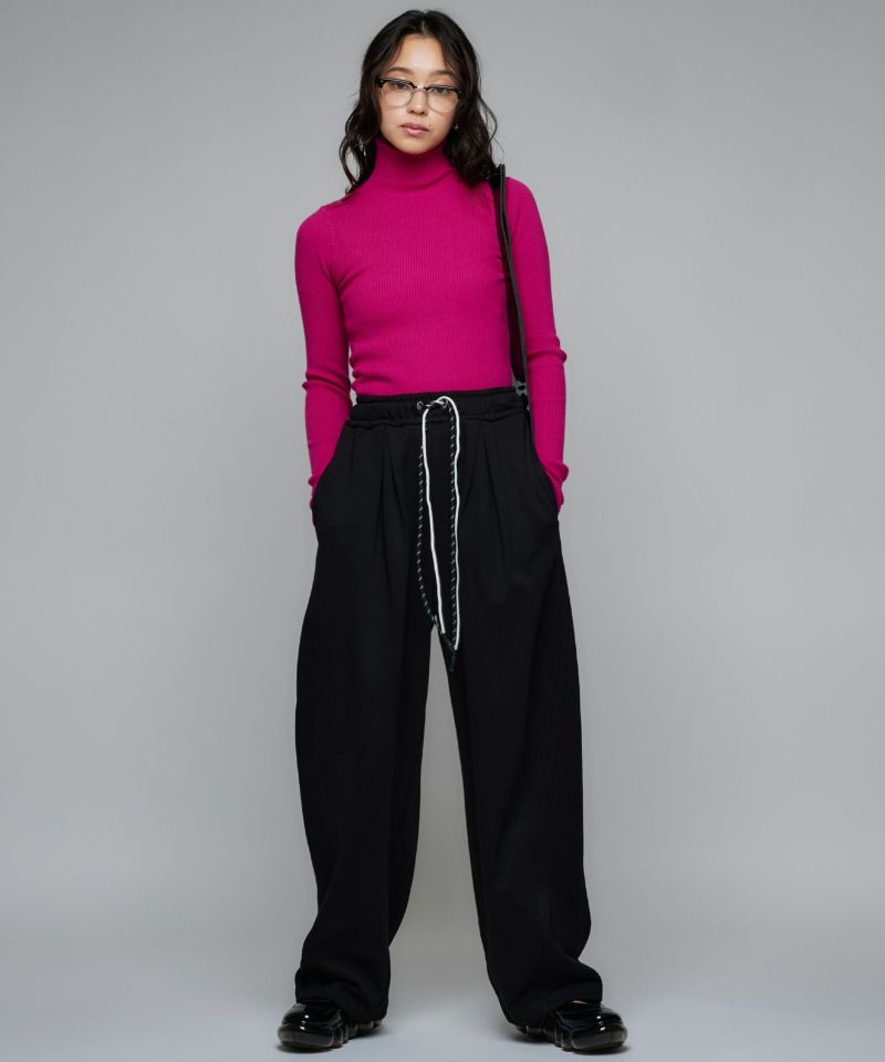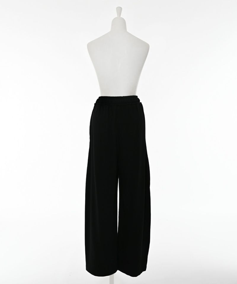 ゆとりのあるカーブシルエットが脚のラインを拾いすぎず、自然な立体感を演出します。ウエストはゴム仕様でゆったりと着用することができ、紐付きでお好みのフィット感に調整しやすいデザイン。シンプルながら、ウエスト紐のデザインがアクセントになるのもポイント。存在感のあるシルエットでありつつ、主張をしすぎない、バランス良く合わすことができる万能デザイン。