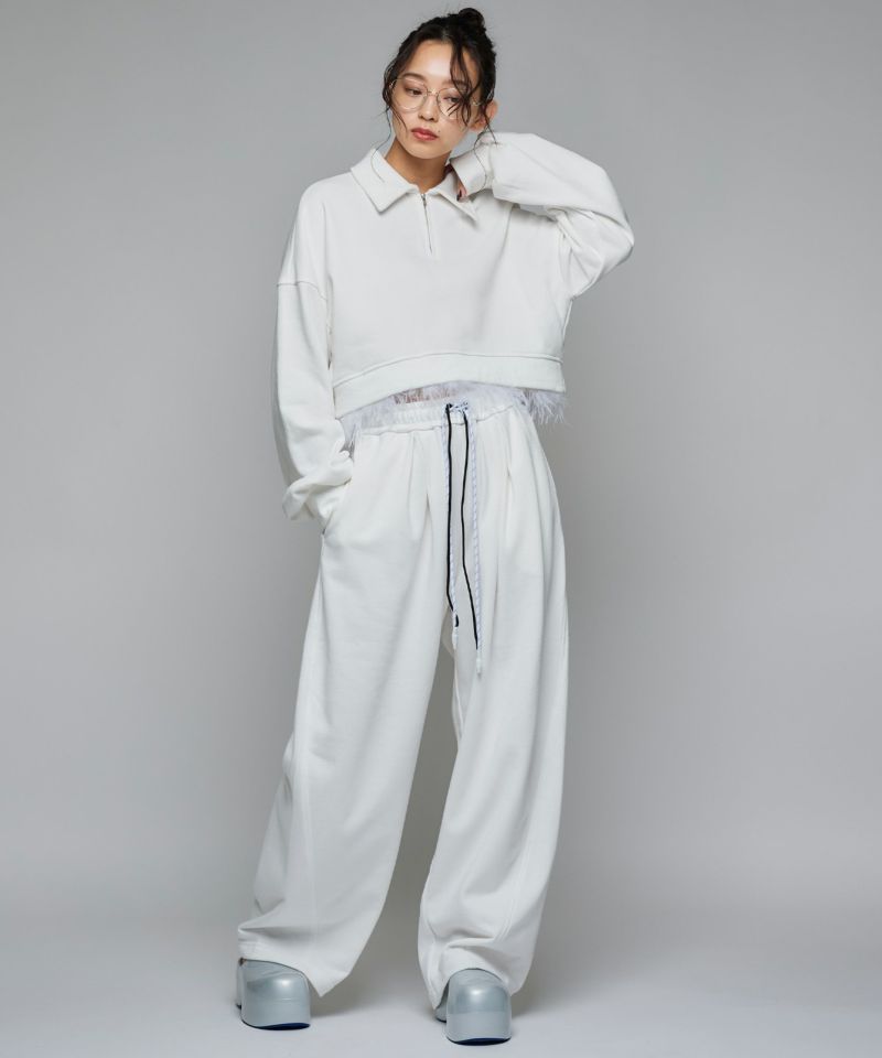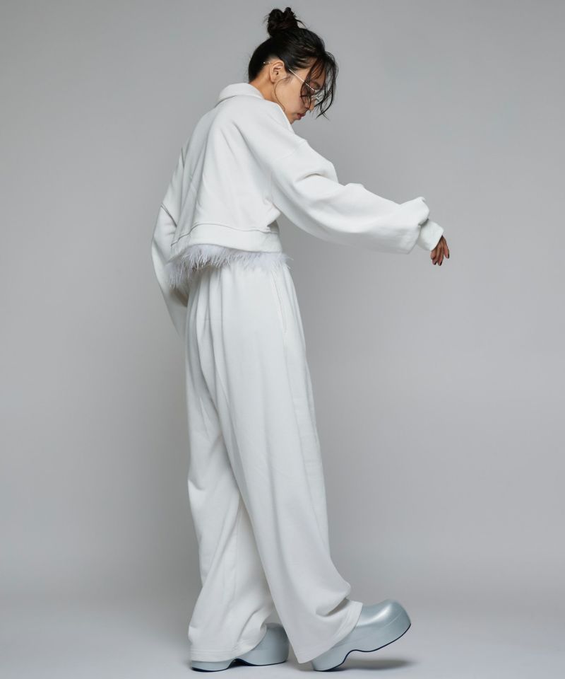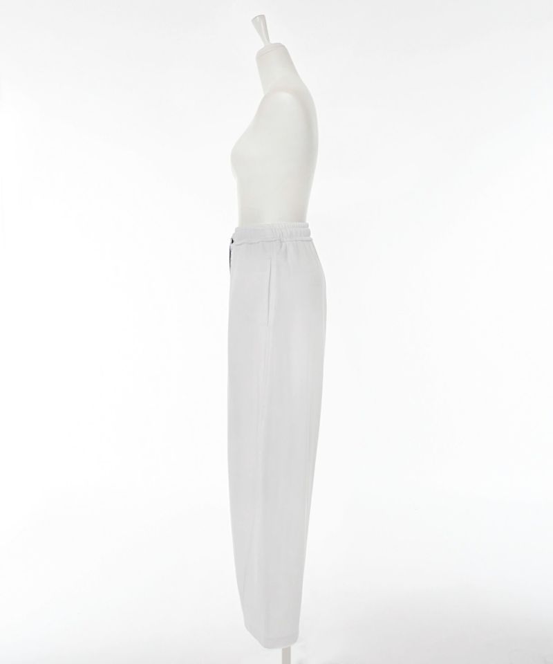 ゆるやかなカーブラインが特徴で、履くだけで自然とトレンド感のあるスタイルを演出してくれる一枚。リラックス感のあるスウェット素材でありながら、すっきりとした印象に見せてくれるので、ラフになりすぎない大人っぽい着こなしを叶えます。