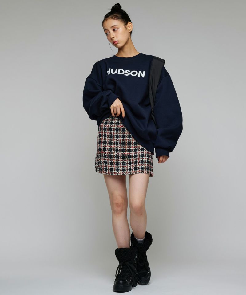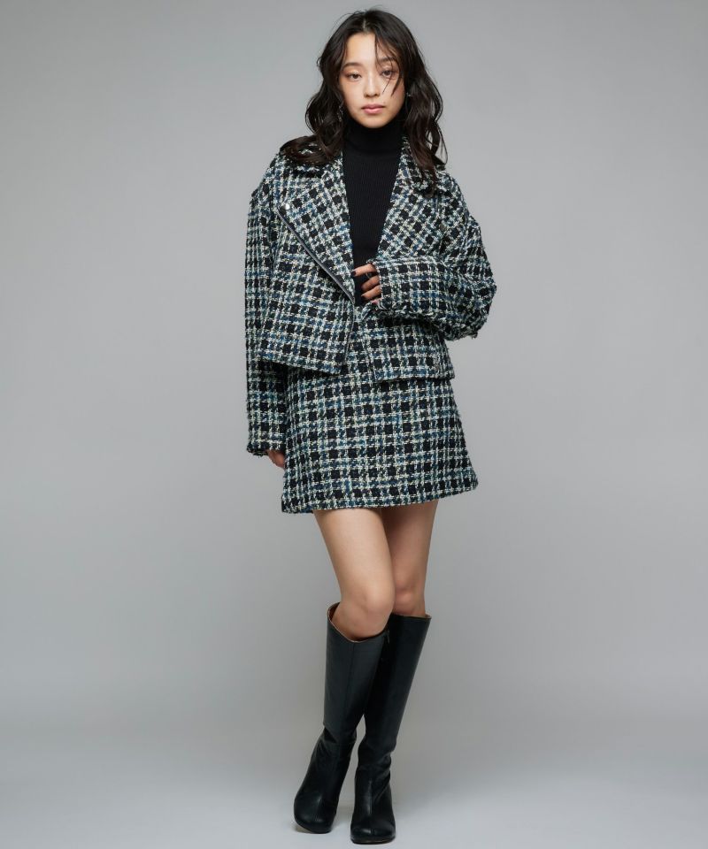 オーバーサイズのニットやカーディガンで合わせてカジュアルダウンさせたスタイルや、ブラウスやシャツをインスタイルで合わせるときれいめな印象になり、パーティーシーン等でも活躍。同素材のツイードライダースジャケット(PIC907090)とセットアップでの着用もおすすめです。