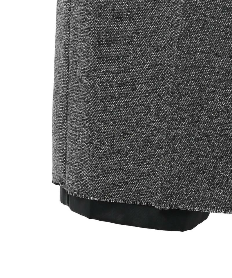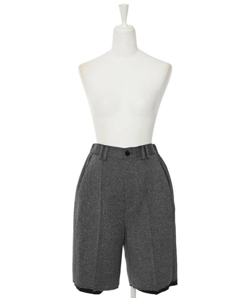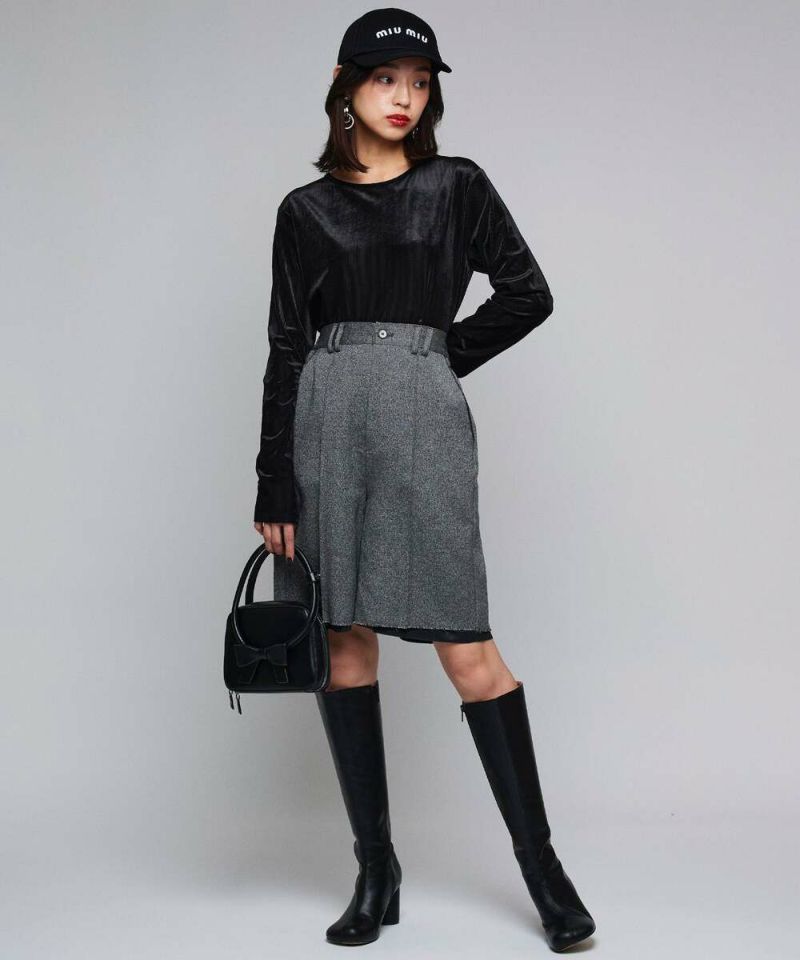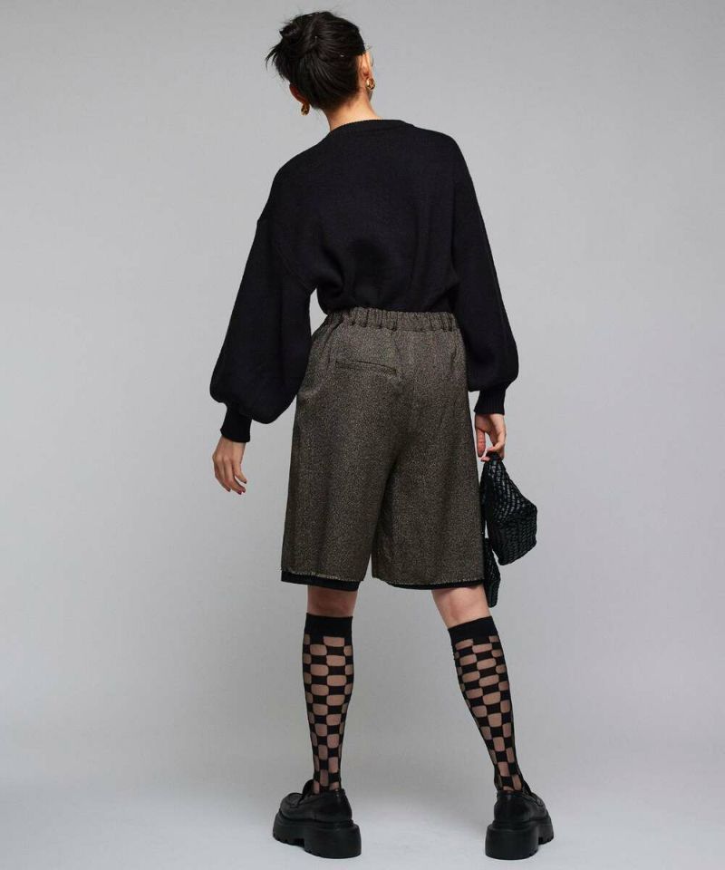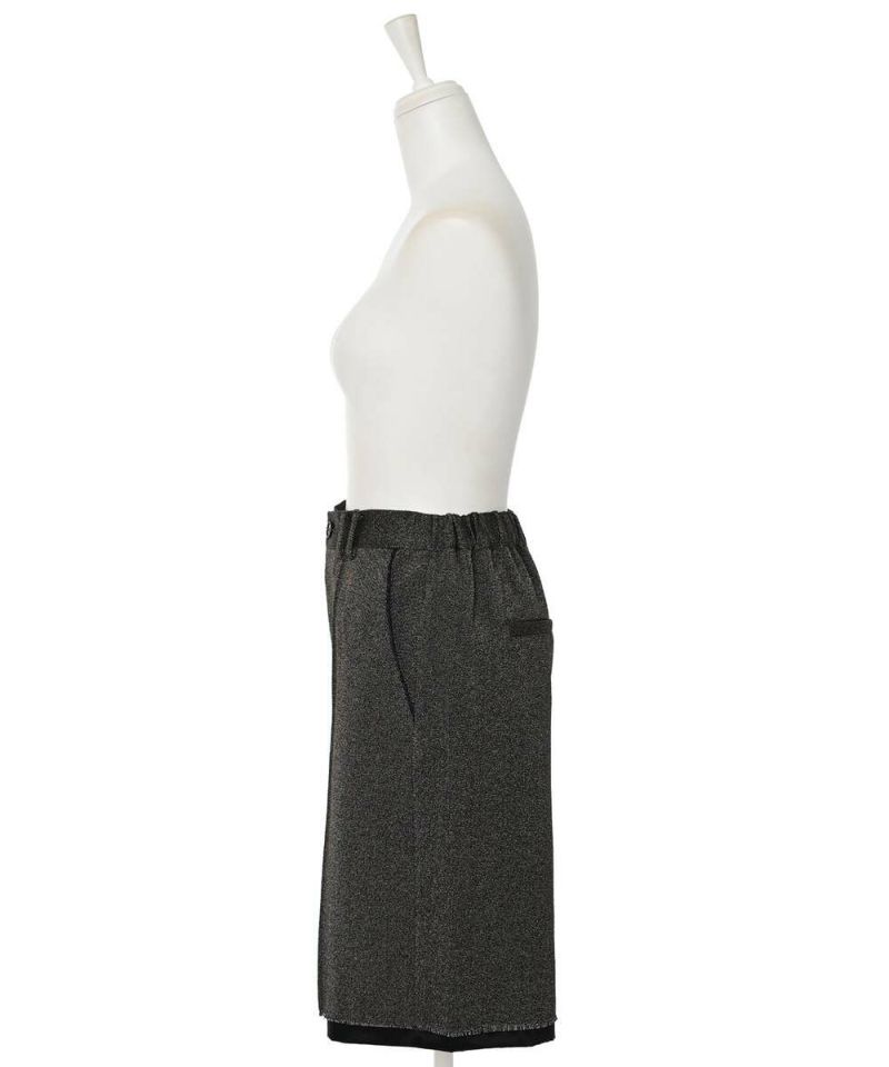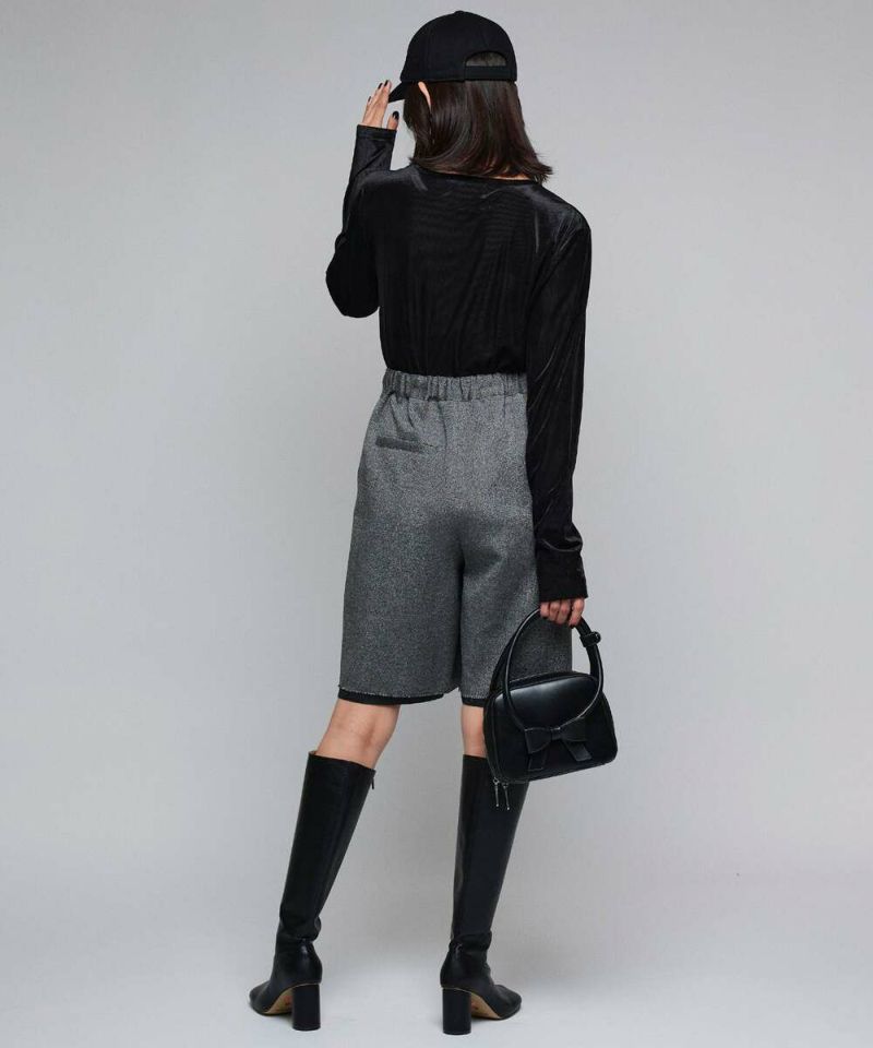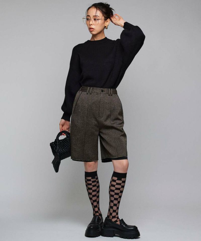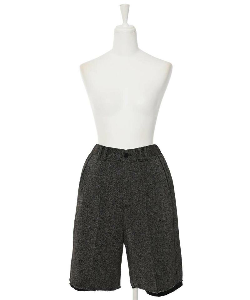 【MIDVEIN】“ストリートとモードを軸とし派生していく 遊び心のあるデザインをリアルクローズに” をコンセプトに“ ニューカジュアル ”を提案しているブランド。ツイード素材にラメ入り糸が混じり上品な印象を与えつつも、あえて裏地を長めに設定させることで、カジュアルさをプラスしたハーフパンツ。抜け感のあるデイリースタイルにピッタリなアイテム。短すぎず長すぎない大人女子に丁度良い丈感がポイント。【model】:H165 B78 H83 / H163 B78 H84
