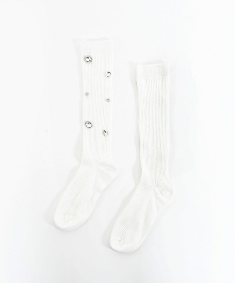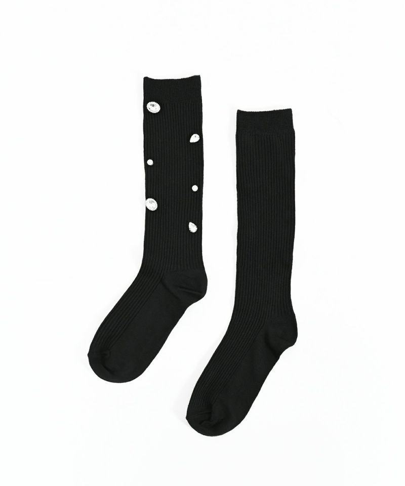 サイズの異なるビジューが輝くラグジュアリーなデザインソックス。着用しやすいさらっとした生地で、伸縮性のあるリブデザイン。足元を華やかにしてくれるアイテム。※洗濯は手洗いを推奨しております。