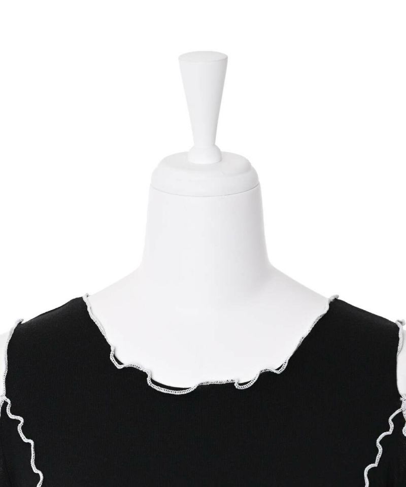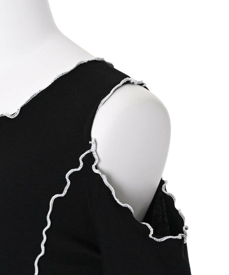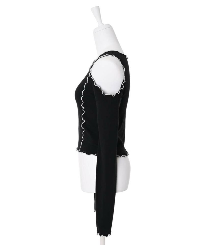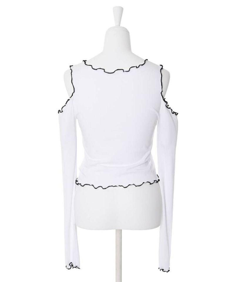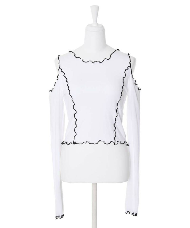 アクセントになるメロウの配色が旬のトップス。程よい肩の肌みせでヘルシーさをプラス。モダール混の肌当たりの良い素材感で着心地も◎【model】H163 B78 H84