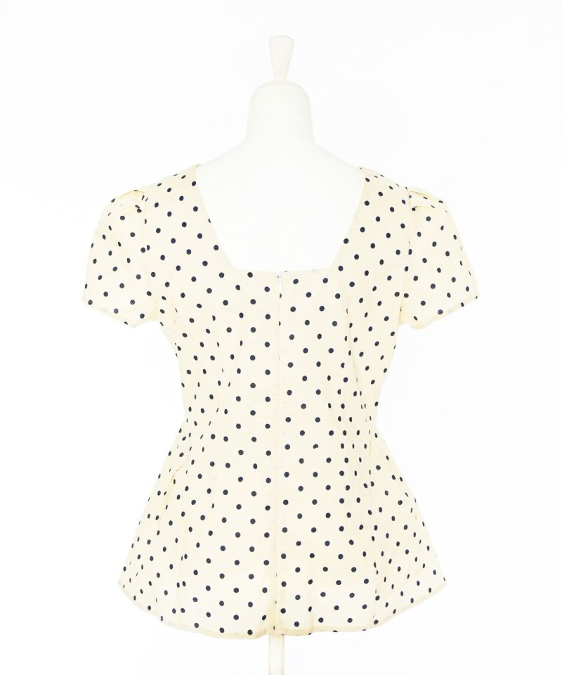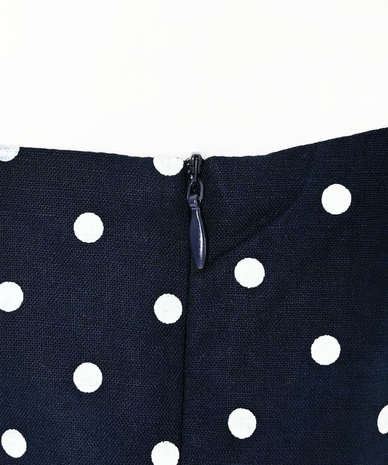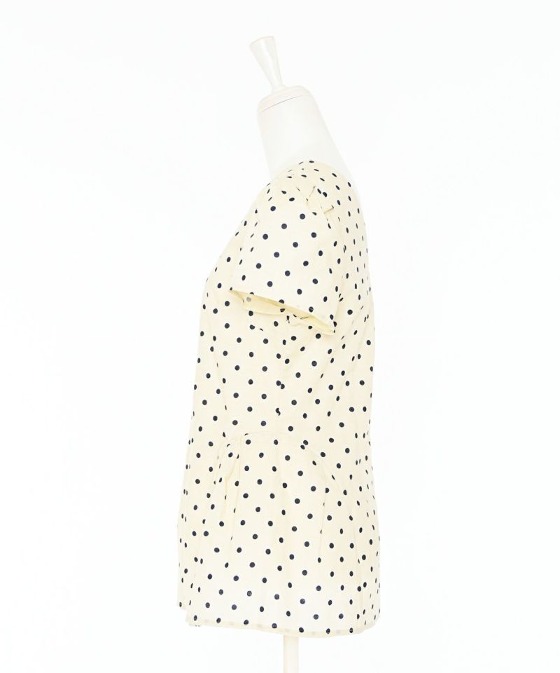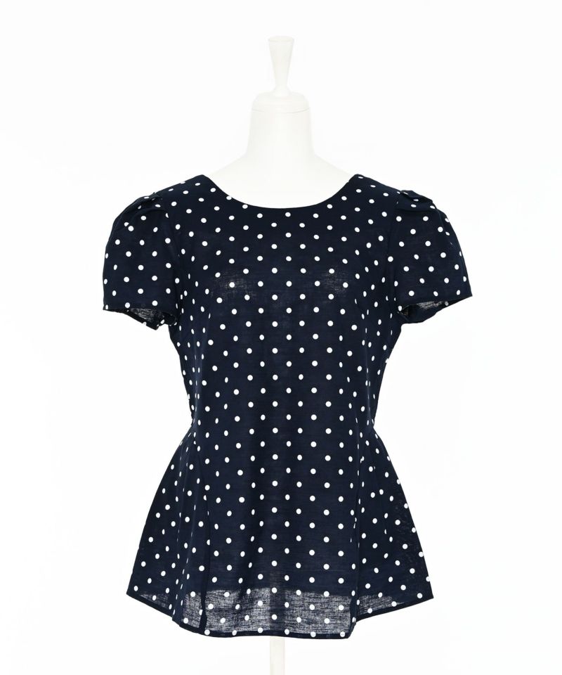 レトロな雰囲気のドット柄を全体に使用したパフトップス。さりげないペプラムシルエットがくびれを強調してくれ、スタイルアップ効果に。パフスリーブと肌見せのバックスタイルが女性らしさをプラス。リネン素材を使用していることで、風通しと着心地の良さ◎着脱しやすいジップアップを採用。
