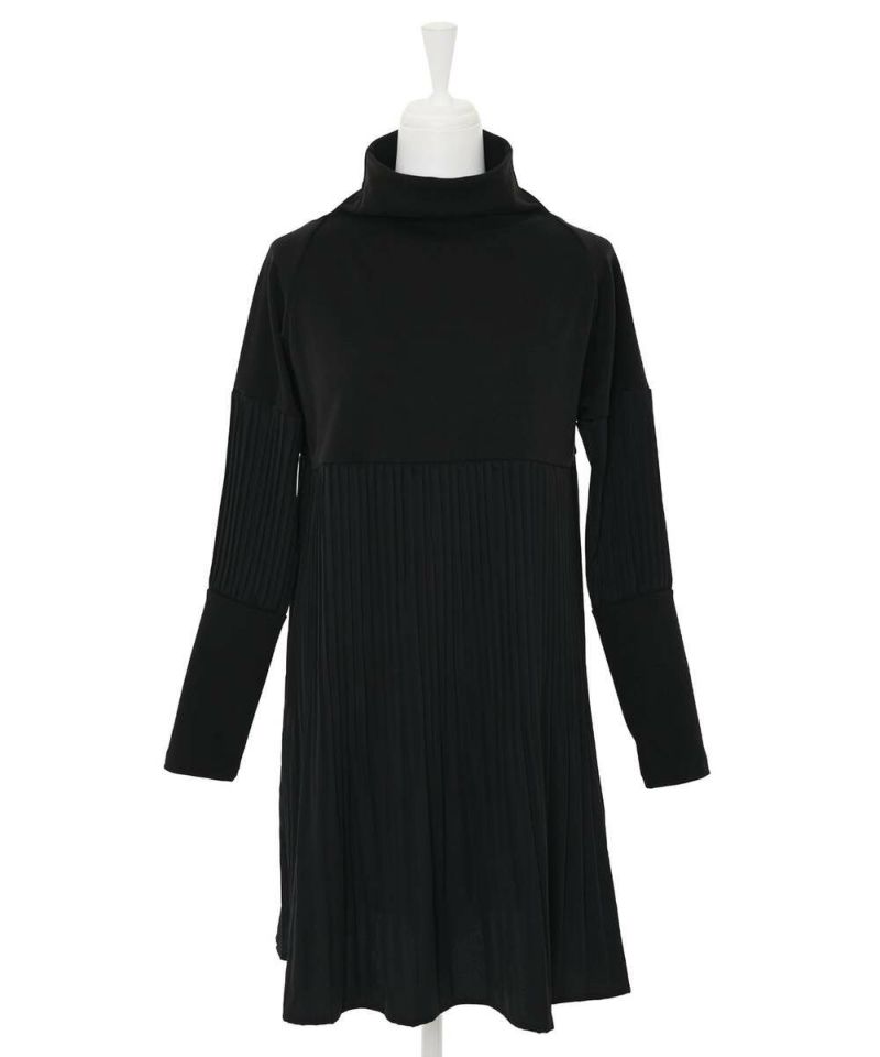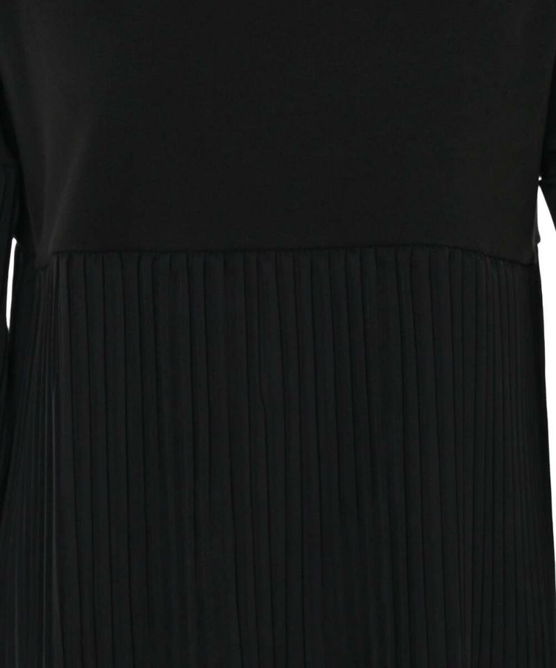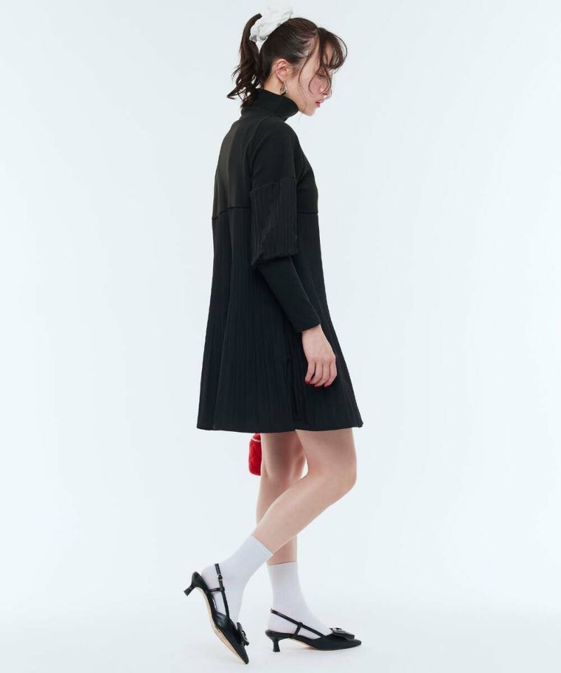 ニット素材にプリーツ加工された異素材をドッキングしたワンピース。パフスリーブで気になる部分のカバーをしてくれ、肘から手首にかけてタイトなシルエットが細見え効果を期待。ストンとした落ち感のプリーツがスタイリッシュな印象に。【model】H160 B80 H85