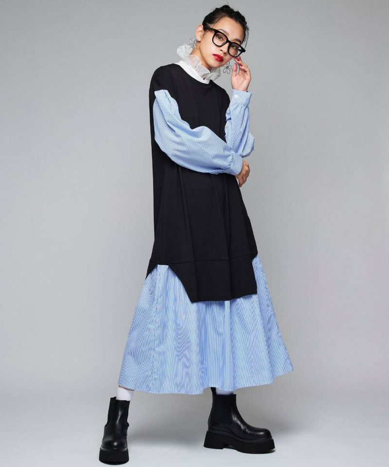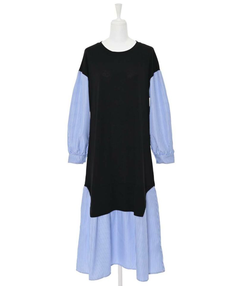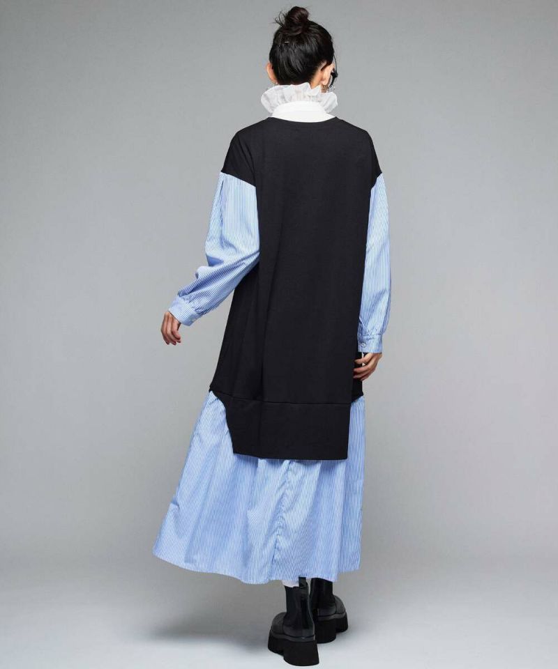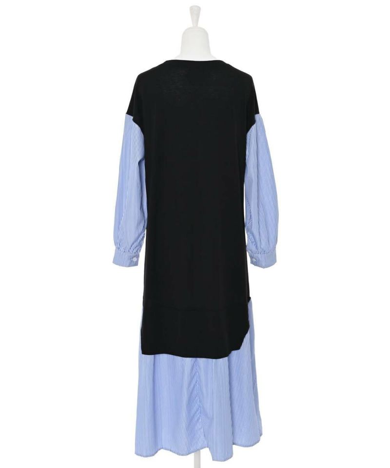 異素材をドッキングしたシャツワンピース。薄手で着心地と風通しの良い素材感なので、ロングシーズン着用できるのが嬉しいポイント。1枚でカジュアルにもフェミニンにも仕上がる、こなれ感のあるドッキングデザイン。【model】H163 B78 H84