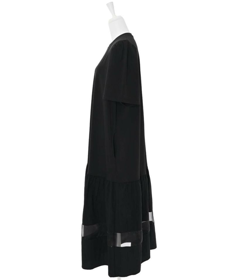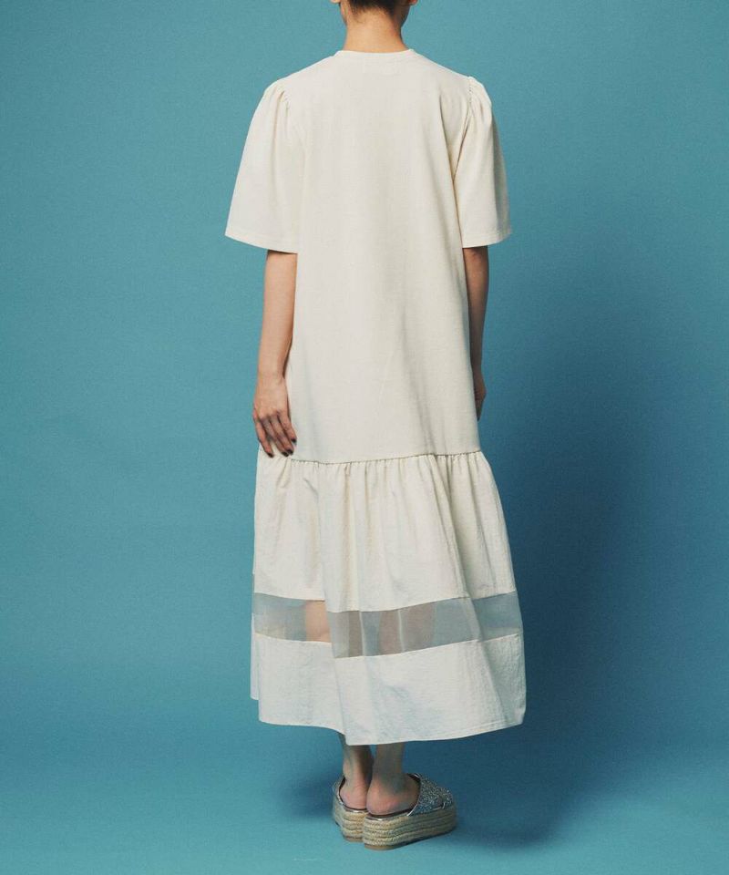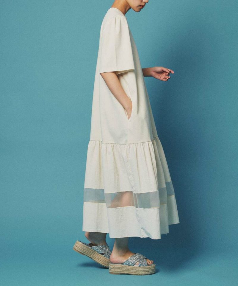 ■ POINTシンプルながらも目を惹く大人のリラックスワンピース。ヒップ下でギャザーを添えた切替えラインのマーメイドシルエット。さらにシアー素材をMIXした洗練されたデザインが魅力。シアー部分から覗く足元がぬけ感をプラス。計算されたシルエットがスタイルアップを叶えてくれるポイント。袖はさりげないパフデザインと五分丈で気になる二の腕をカバー。立体感と程よい女性らしさが魅力的な1枚。ロング丈でもふわっと広がるシルエットで涼しく着用いただけます。ノンストレスな着心地で夏のワードローブにかかせないアイテムに。■ STYLING 1枚でさらっと着るのはもちろん、デニムやボトムとレイヤードしたメリハリのあるコーデもおすすめ。ボディーラインを拾わないゆとりあるシルエットとサイドポケット付きでタウンユース、リゾートにもおすすめ。モード、カジュアル、フェミニンなど合わせるシューズや小物も選ばない着回し力の高さが魅力。【model】H163 B78 H84