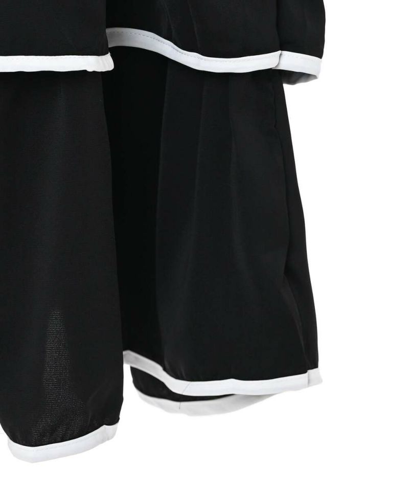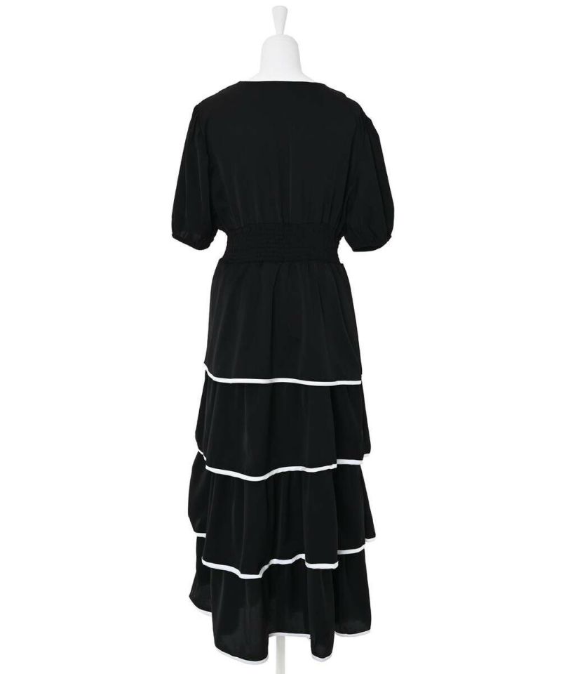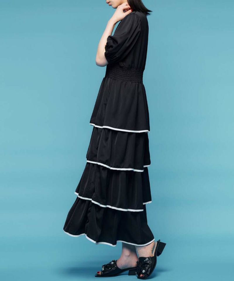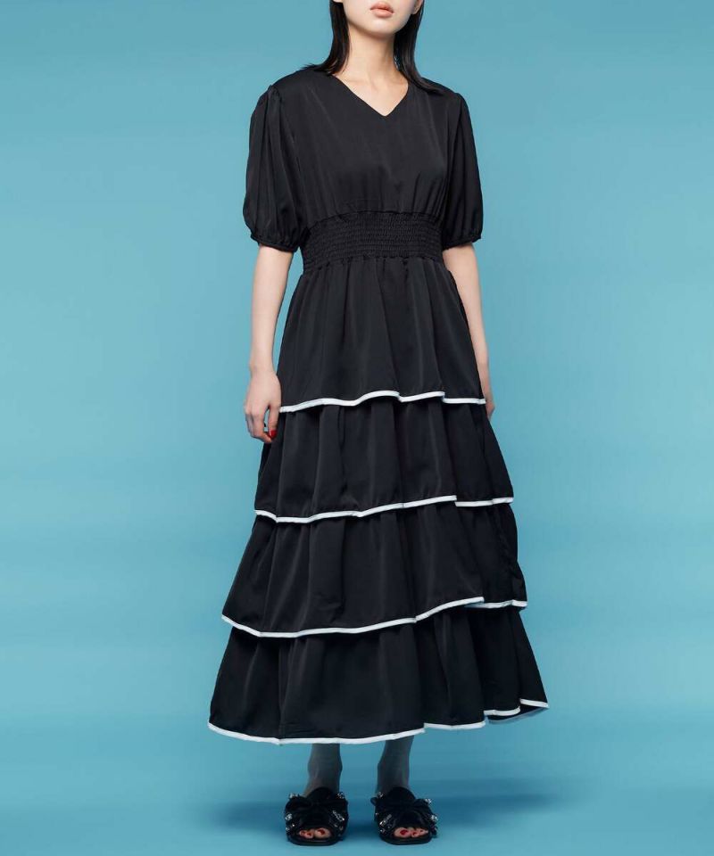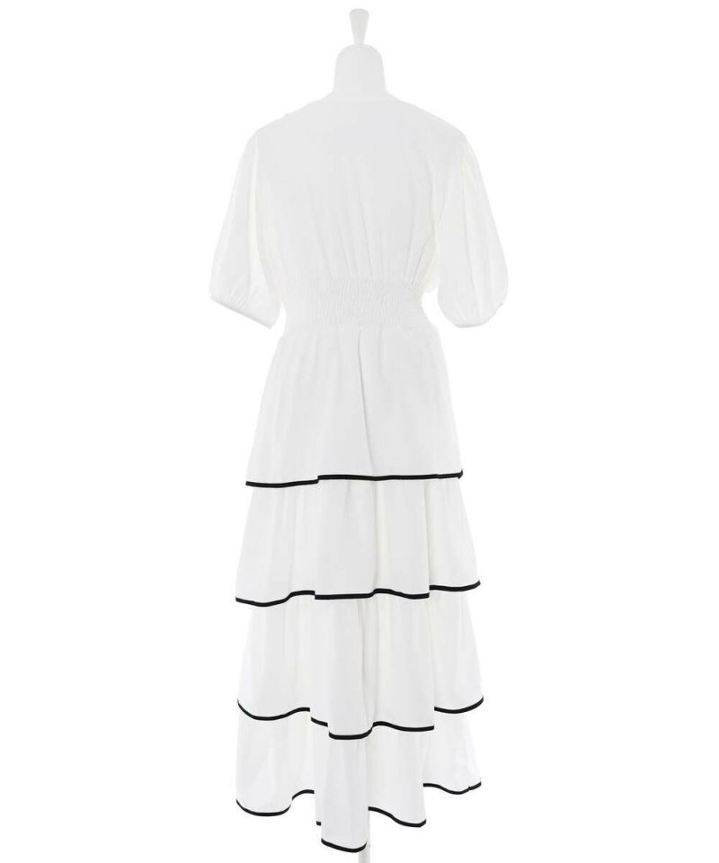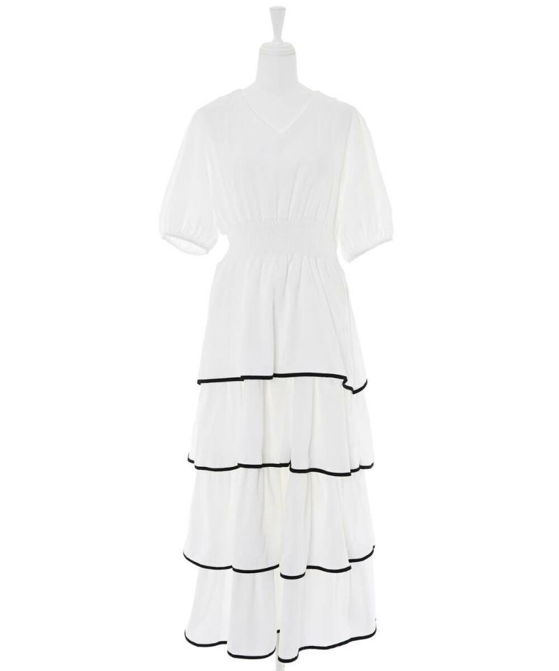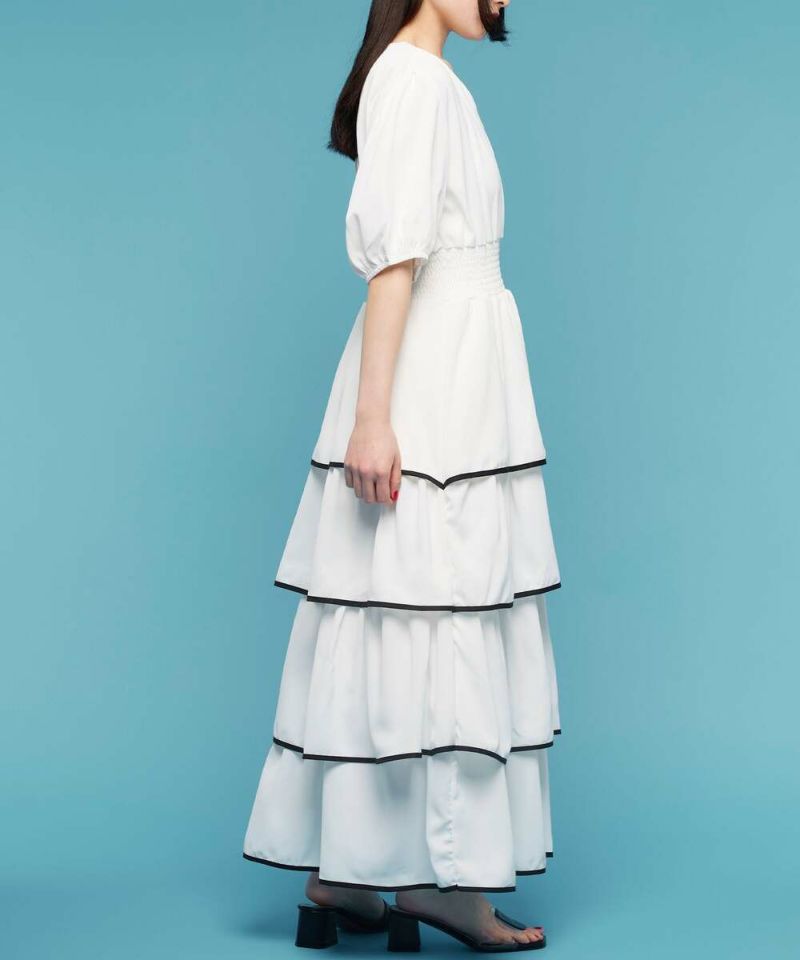 1枚で決まるカンカンワンピース。フリル部分にバイカラーでパイピング加工がされていることで、フェミニンな印象をプラス。パフスリーブとVネックが抜け感を。ウエストはゴムなのでストレスフリーに着用できます。