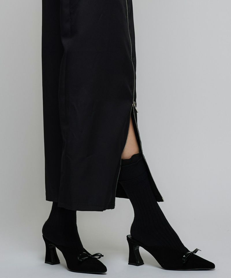 ジップを閉めて着用するだけでなく、中にパンツやタイツをレイヤードして楽しむのもおすすめ。タイトなシルエットなので、上からカーディガンやニットなどを重ねると、気になる部分がカバーできこなれ感も演出できます。