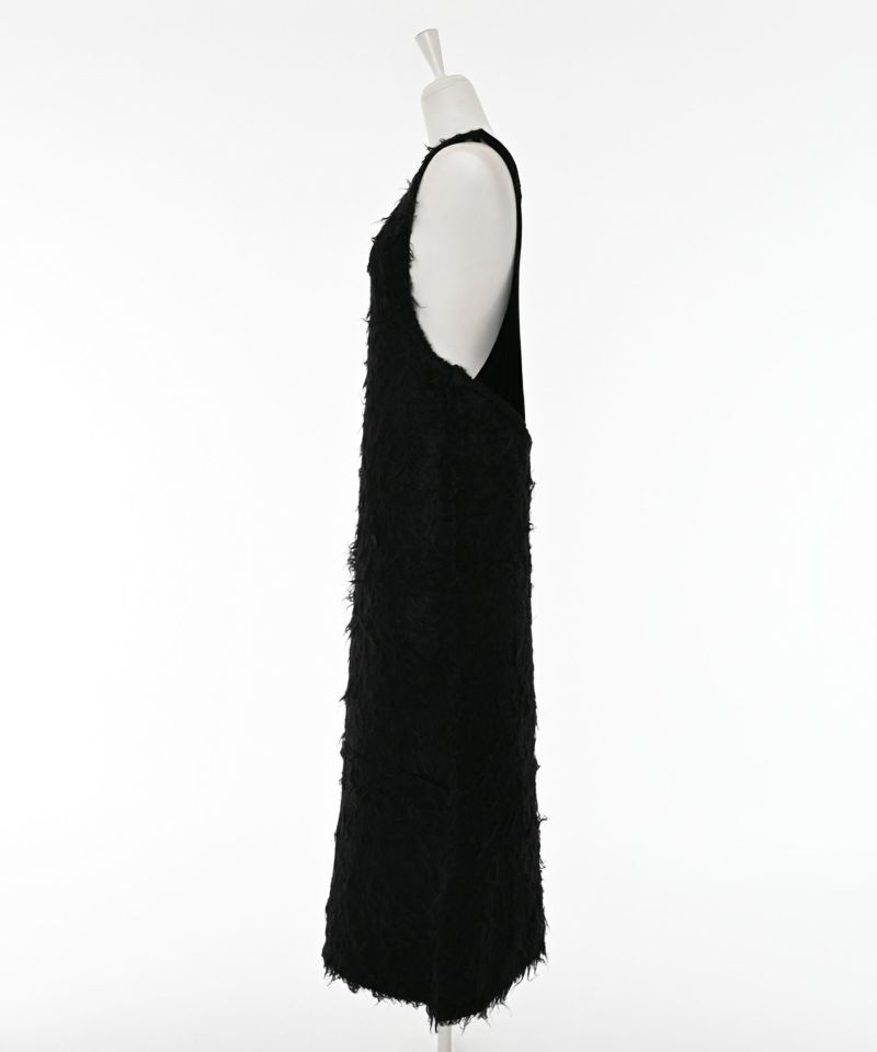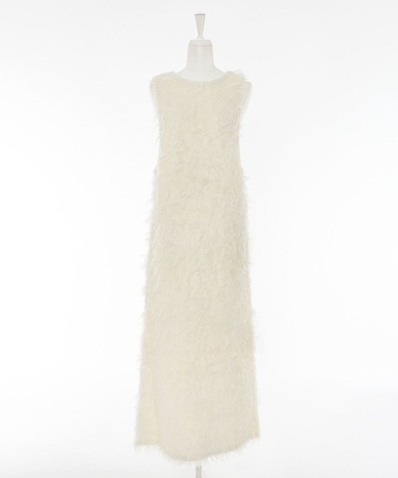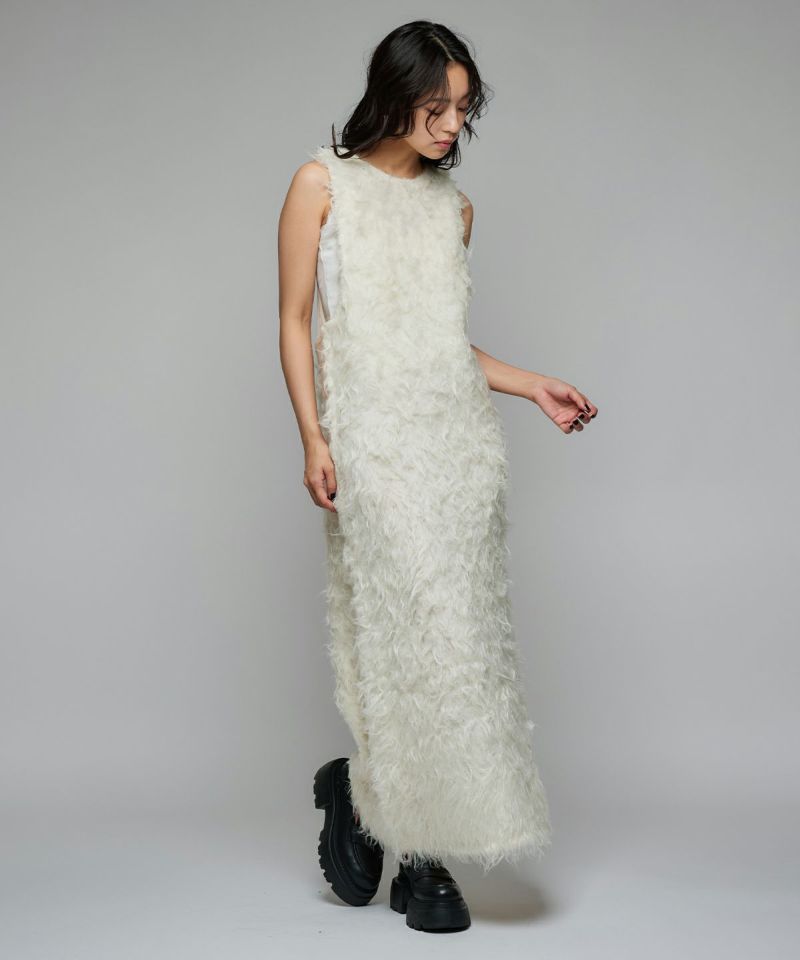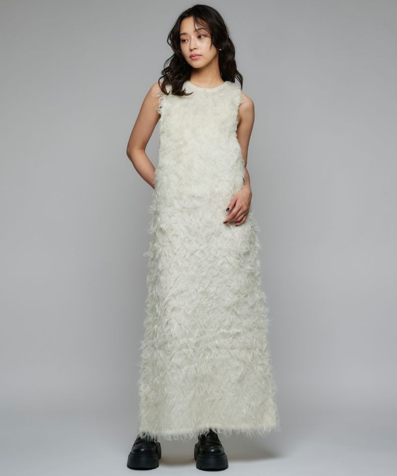 全身を覆うファーの華やかさと、後ろ腰部分まであるベロア素材がアクセントとなったロングワンピース。ラウンドネックとタイトなシルエットがボディラインを美しく引き立て、女性らしい品格を演出します。ノースリーブの脇部分を広めに開けたデザインが抜け感をプラスし、モードな印象を与える一枚です。
