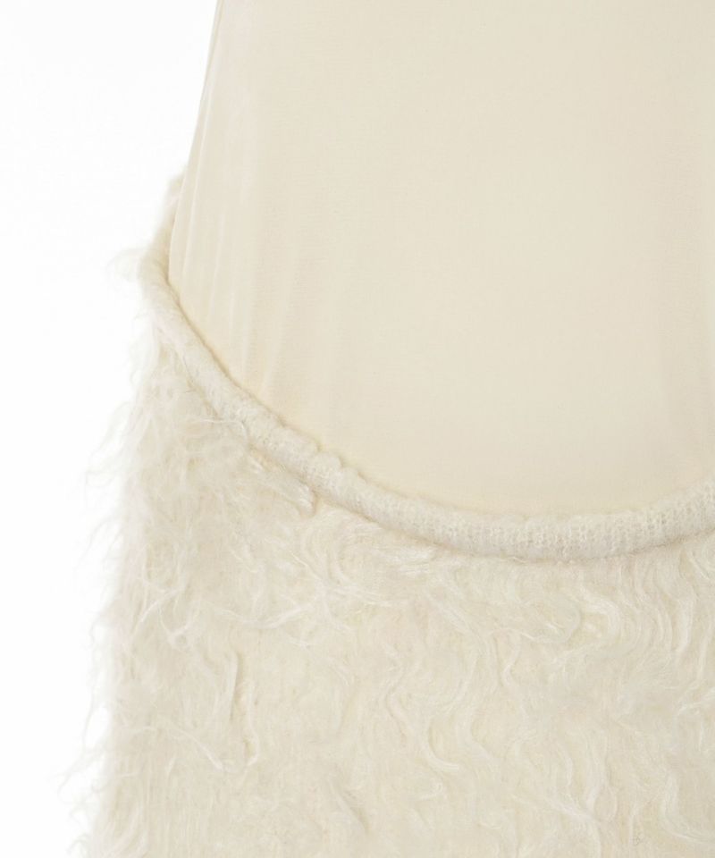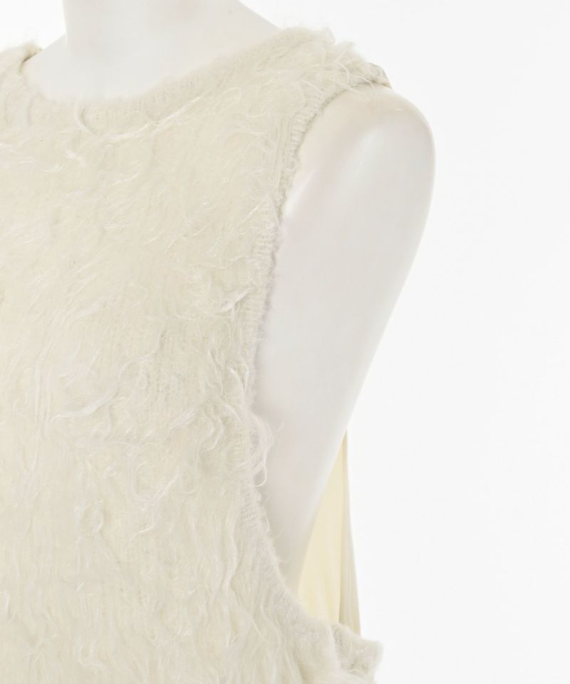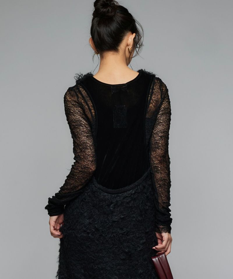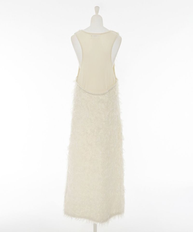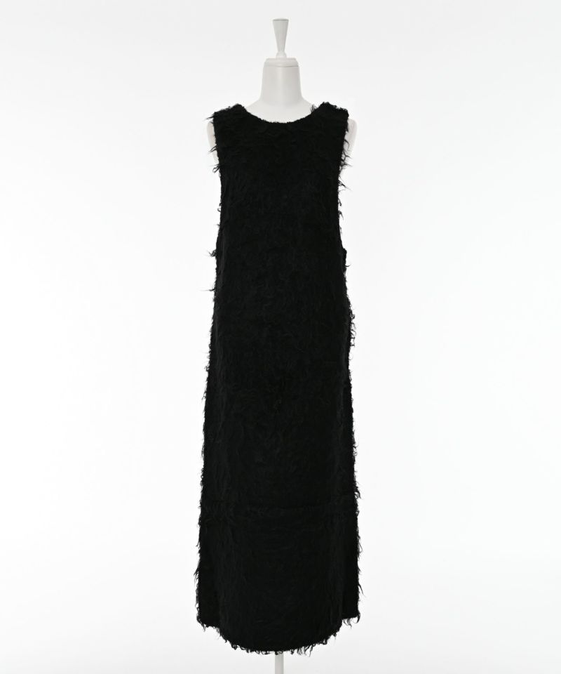 全身を覆うファーの華やかさと、後ろ腰部分まであるベロア素材がアクセントとなったロングワンピース。ラウンドネックとタイトなシルエットがボディラインを美しく引き立て、女性らしい品格を演出します。ノースリーブの脇部分を広めに開けたデザインが抜け感をプラスし、モードな印象を与える一枚です。