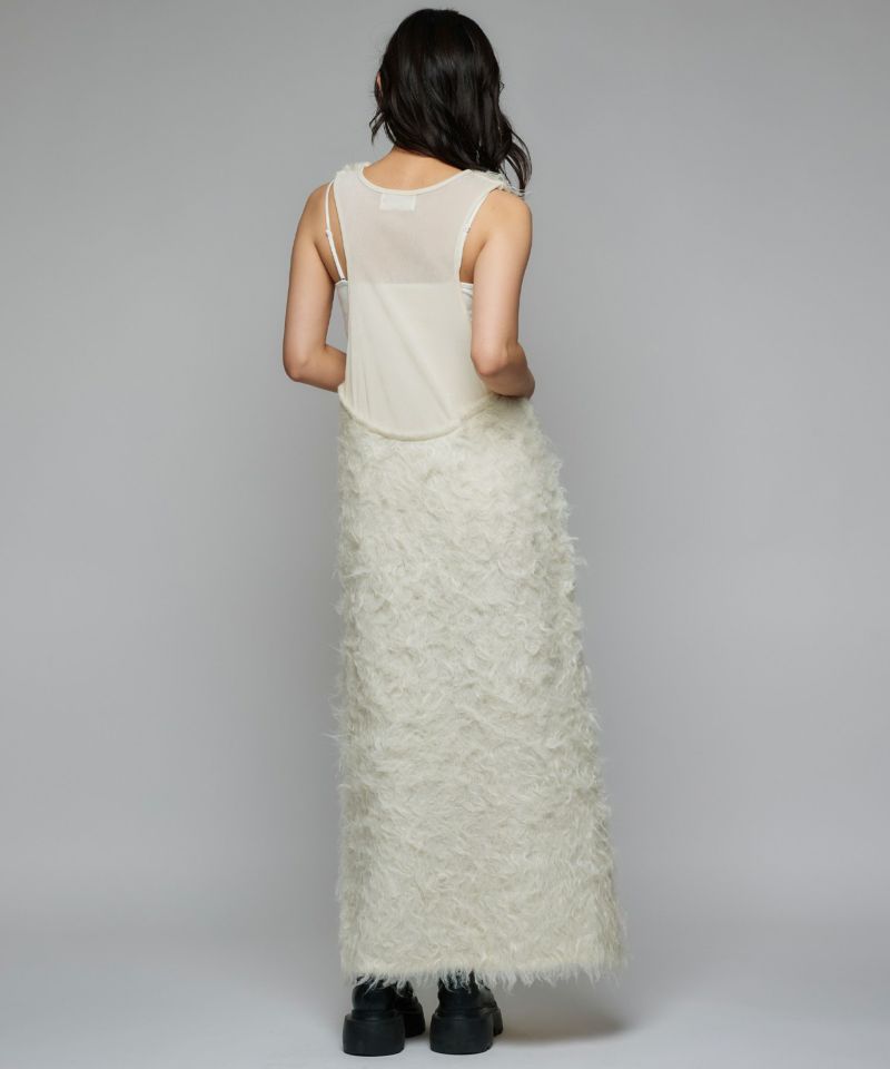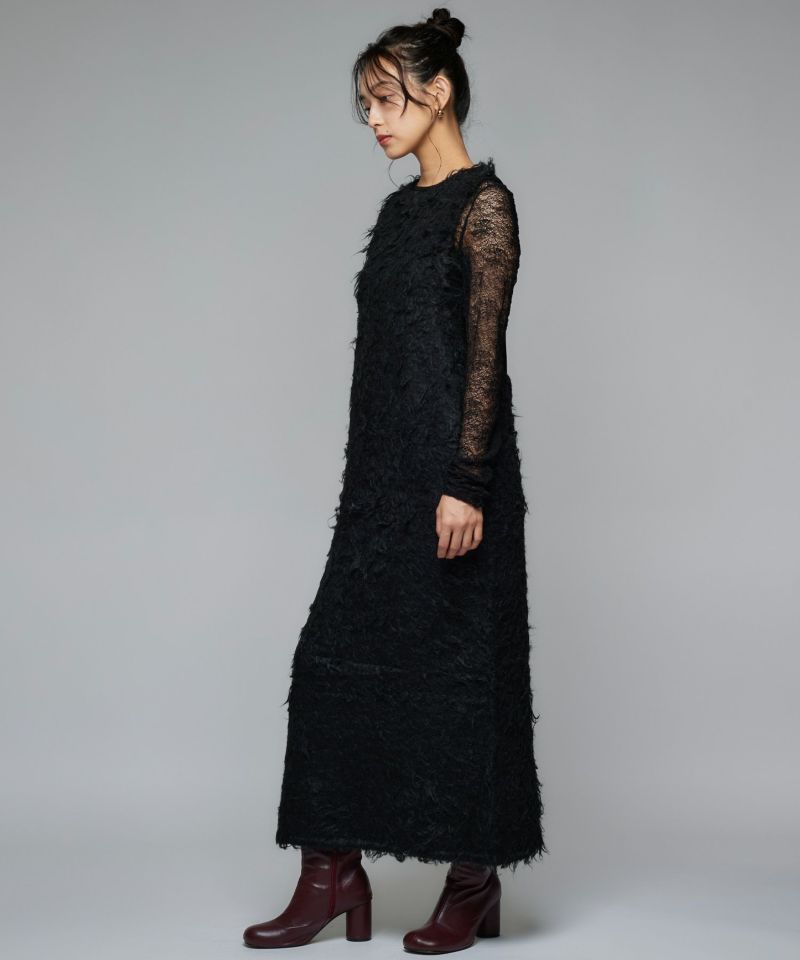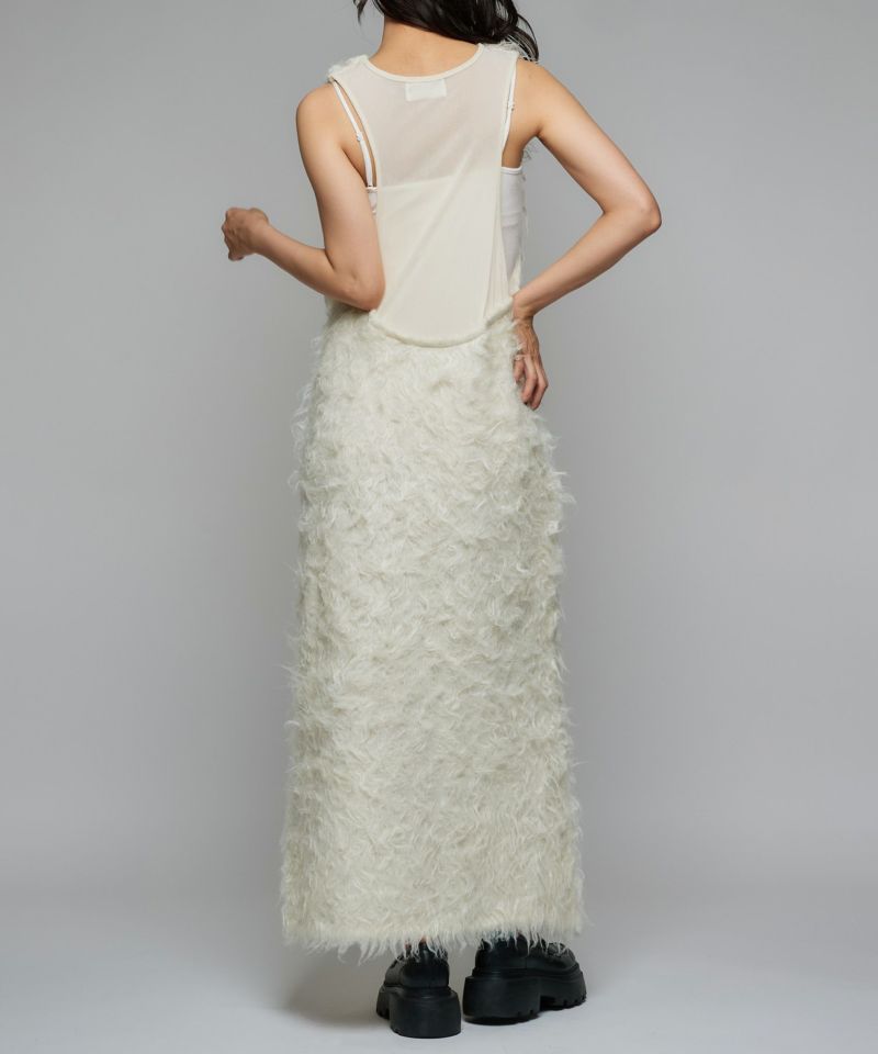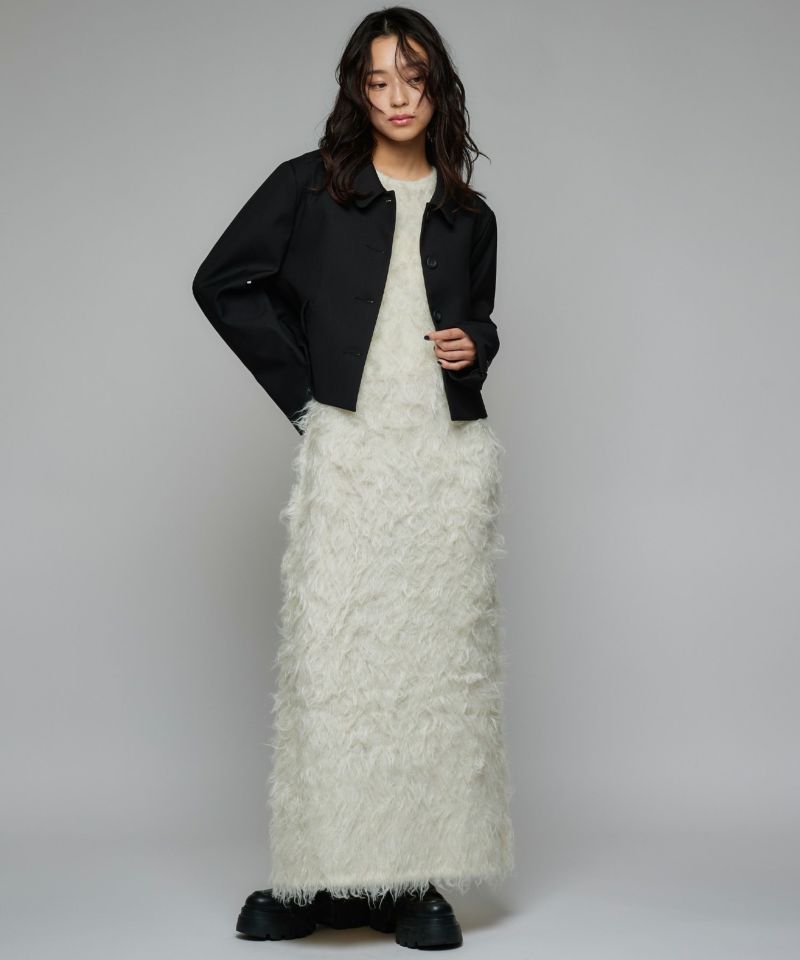 全身にあしらわれたファーとタイトなシルエットが、しなやかで上品な女性らしさを引き立てるロングワンピース。柔らかな質感が優雅なムードを纏い、歩くたびに女性らしい美しさを際立たせます。