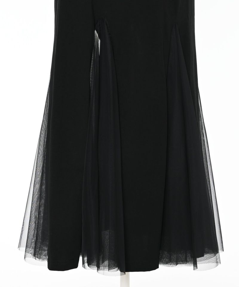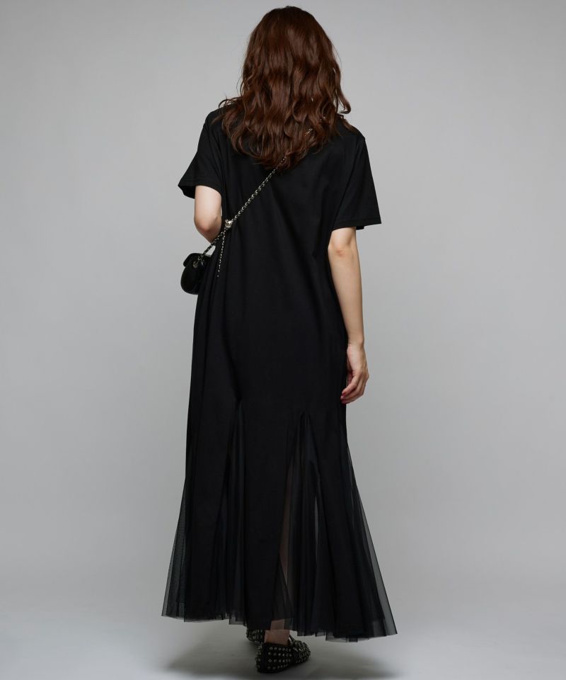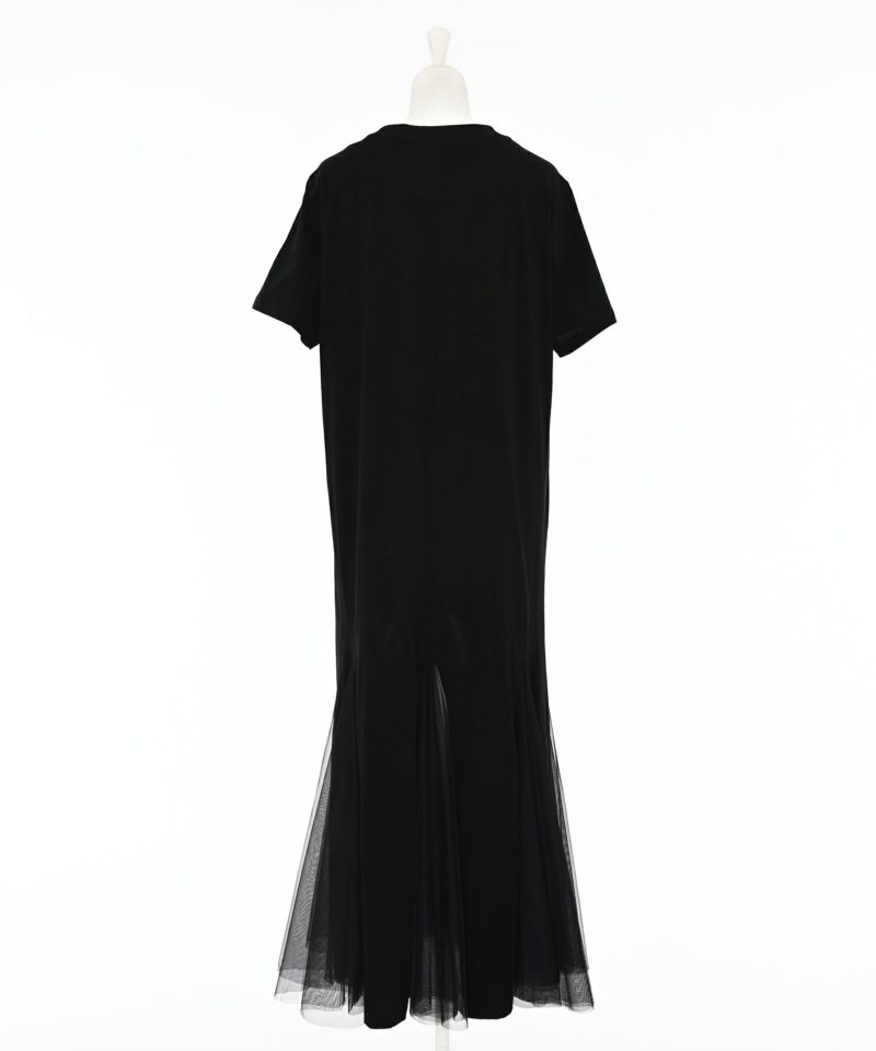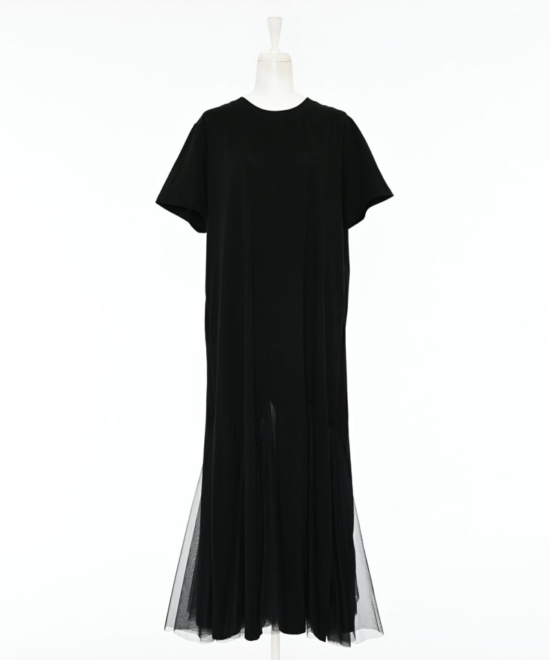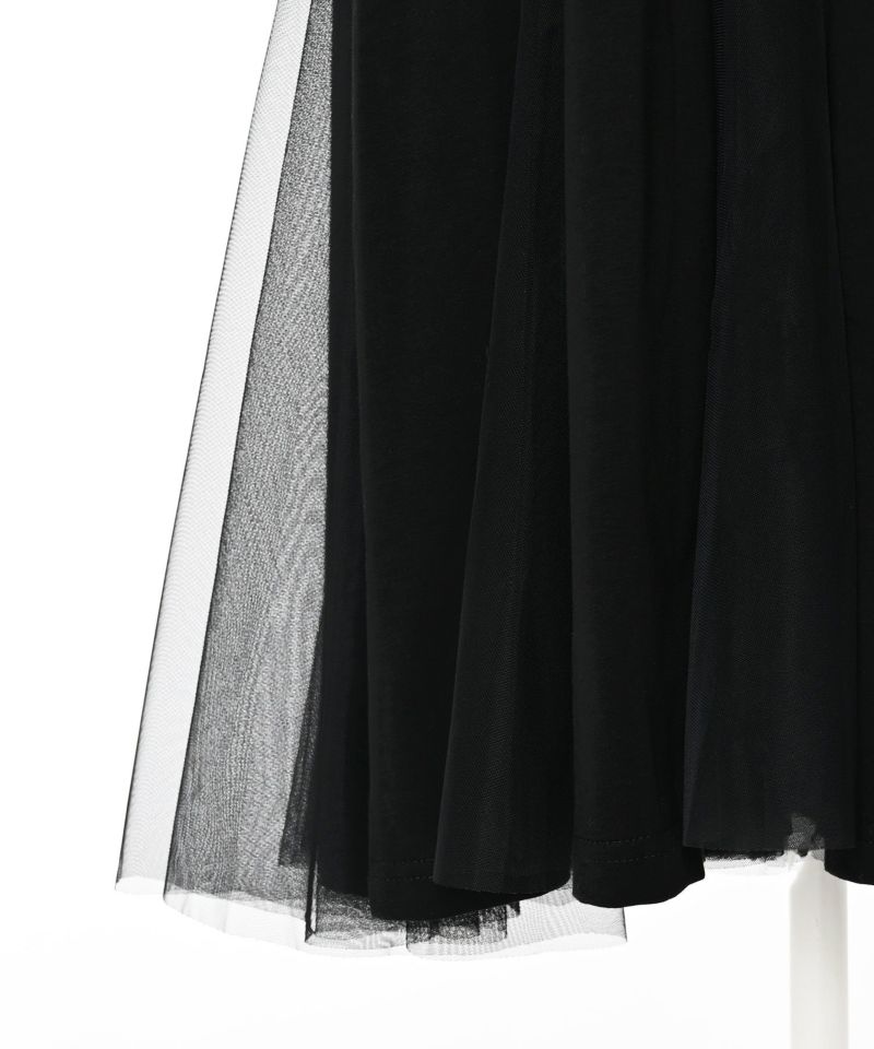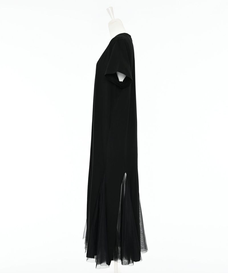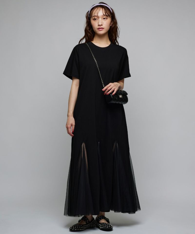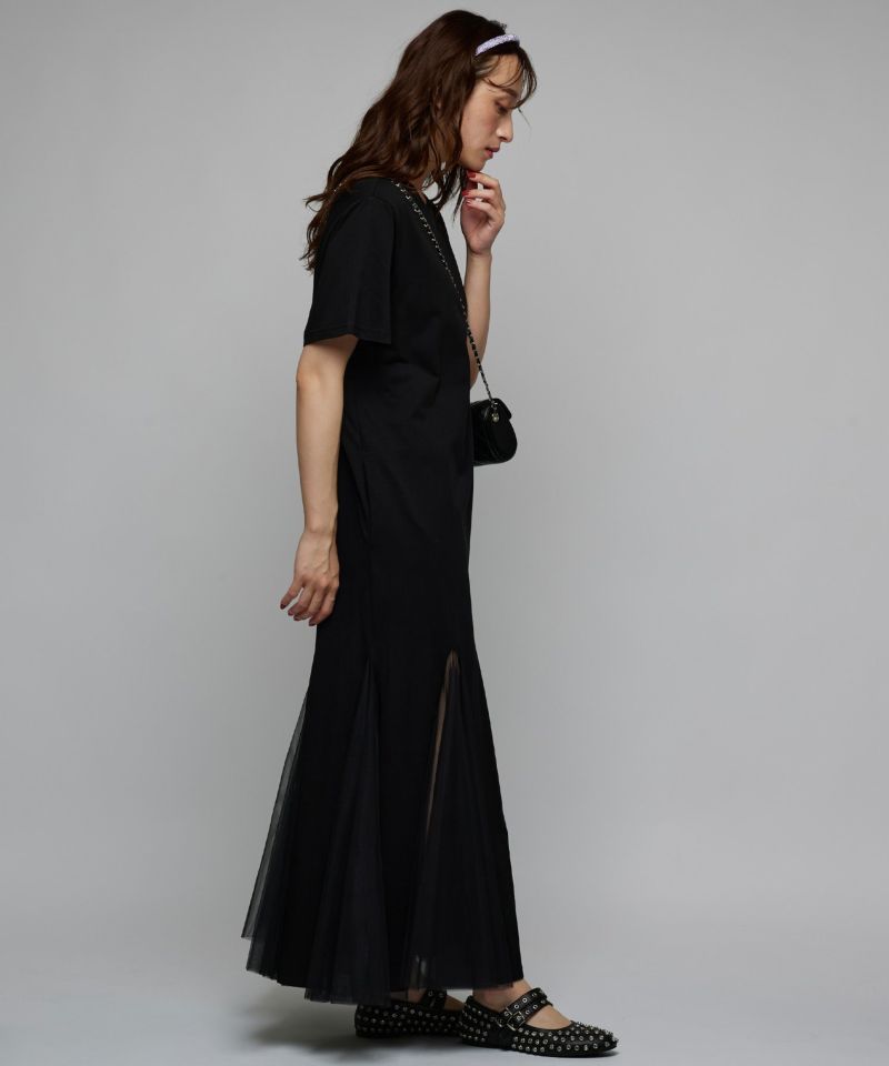 サラッとしたカットソー素材にチュールがドッキングされた落ち感のあるワンピース。深めのスリットにチュール素材を採用し、動くたびにチラ見えする肌が女性らしさをアピール。一枚で着ていただくのはもちろん、デニム等レイヤードするのもオススメ◎Narcissusで大人気のつけ襟をプラスするとエレガントな雰囲気に。【model】H160 B80 H85