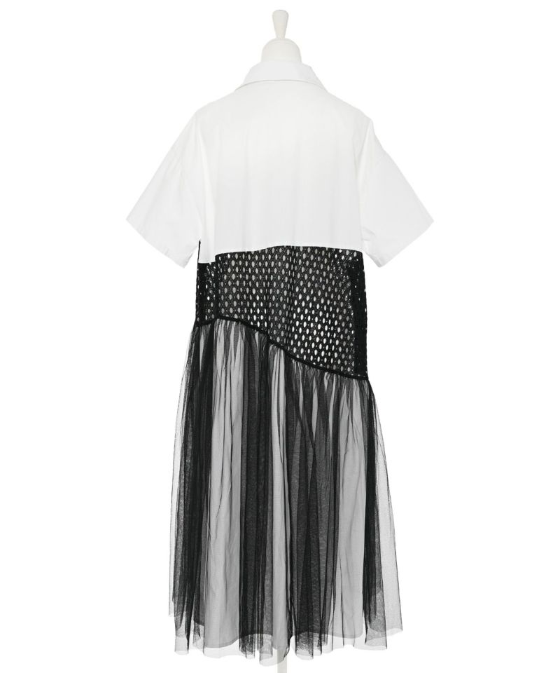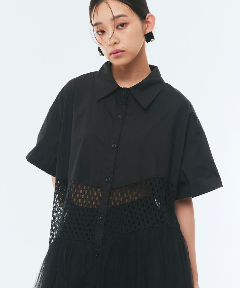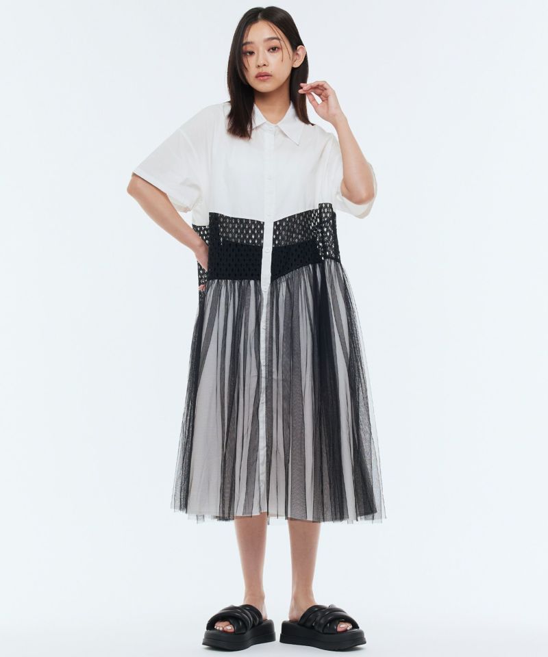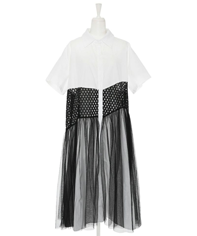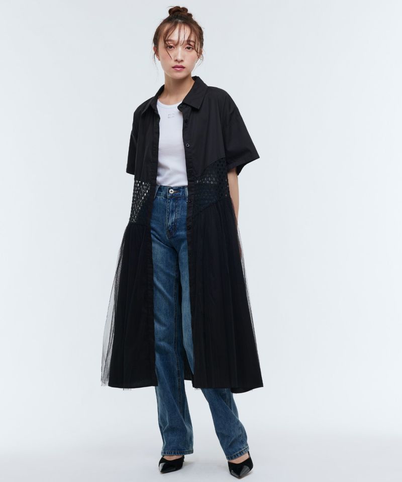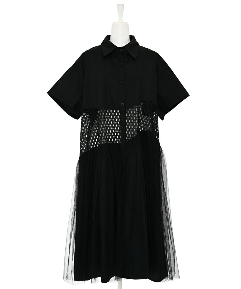 ロングシャツにメッシュ素材とチュール素材をドッキングさせた一枚でスタイリングが完成するモードな雰囲気のデザインワンピース。ゆったりとしたシルエットに、メッシュデザインが抜け感をプラス。スタイルアップ効果のあるハイウエスト切り替えで、ボタンを開けると羽織りとしても着用可能なアイテム。肌見せが苦手な方やインナーの切り替えが気になる方は、タイトなワンピース等がオススメです。カラー物をインナーに取り入れるとお洒落上級者に。【model】H160 B80 H85/H163 B78 H84